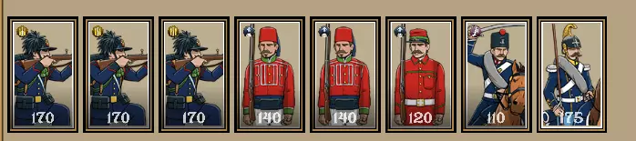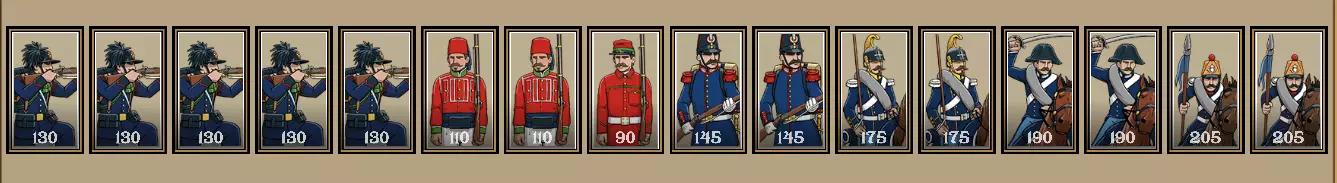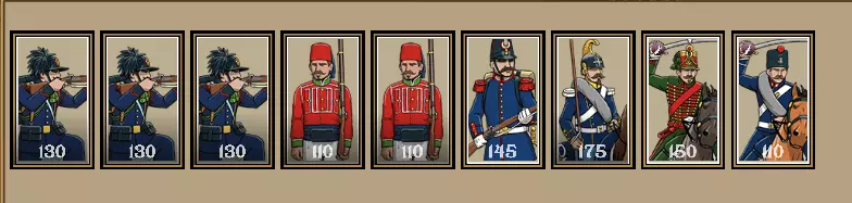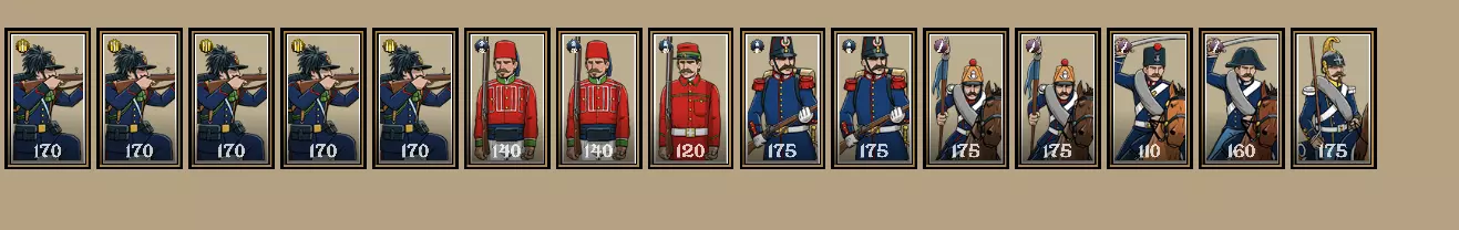 你的终极强者配置。使用这个配置,你将无往不利。 由于我真心希望你能用这个配置大杀四方,我会为你讲解一个非常出色的策略。你需要将精英轻步兵部署在其他线列步兵和掷弹兵前方,同时将骑兵分为两组:一组专门负责绕后攻击敌人,其中龙骑兵和卡宾枪骑兵需部署在前方,以便这支强悍的骑兵能穿越各种地形;另一组应是枪骑兵,他们要么进行侧翼包抄,要么直接正面冲击敌人阵线。当你的骑兵和步兵已就位准备发起大规模冲锋时(显然要让士兵排成纵队阵型),首先应派遣枪骑兵冲击敌军防线中最薄弱或最重要的部分。在此前一回合,你应该已经摧毁了敌方的炮兵,或者至少迫使他们将注意力集中在后方。枪骑兵发起冲锋后,让轻步兵作为突击部队前进至敌军前方的格子。如果有命令点,应先射击一次然后冲锋;如果没有命令点,则射击一次后等待下一命令阶段再下令冲锋。不要再次开火,因为敌人会以为你不会冲锋而是会排成横队,所以此时正是冲锋的时机。一旦进入近战,你的轻步兵由于其特性应造成+2伤害,因处于攻击队列额外+1伤害,再加上正面冲锋的1点基础伤害。你的祖阿夫兵和掷弹兵应该能与精锐轻步兵一起坚持最久,因为他们拥有更高的生命值,且祖阿夫兵具备近战训练技能。