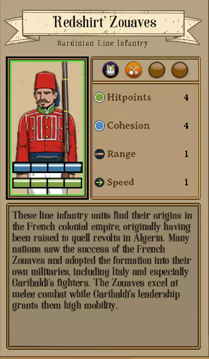 此特性使你在近战中受到的伤害减少1点。由于这些特性之间能很好地相互配合,因此存在一些优秀的单位组合,可让你充分发挥这些特性的优势。例如,将我所说的【精锐轻步兵】( Bersaglieri )与【坚韧】特性放在【红衣朱阿夫兵】前方。这样组合能获得+2冲锋加成,后排几乎不会受到伤害,同时前方单位的【坚韧】特性也让移动更加灵活。