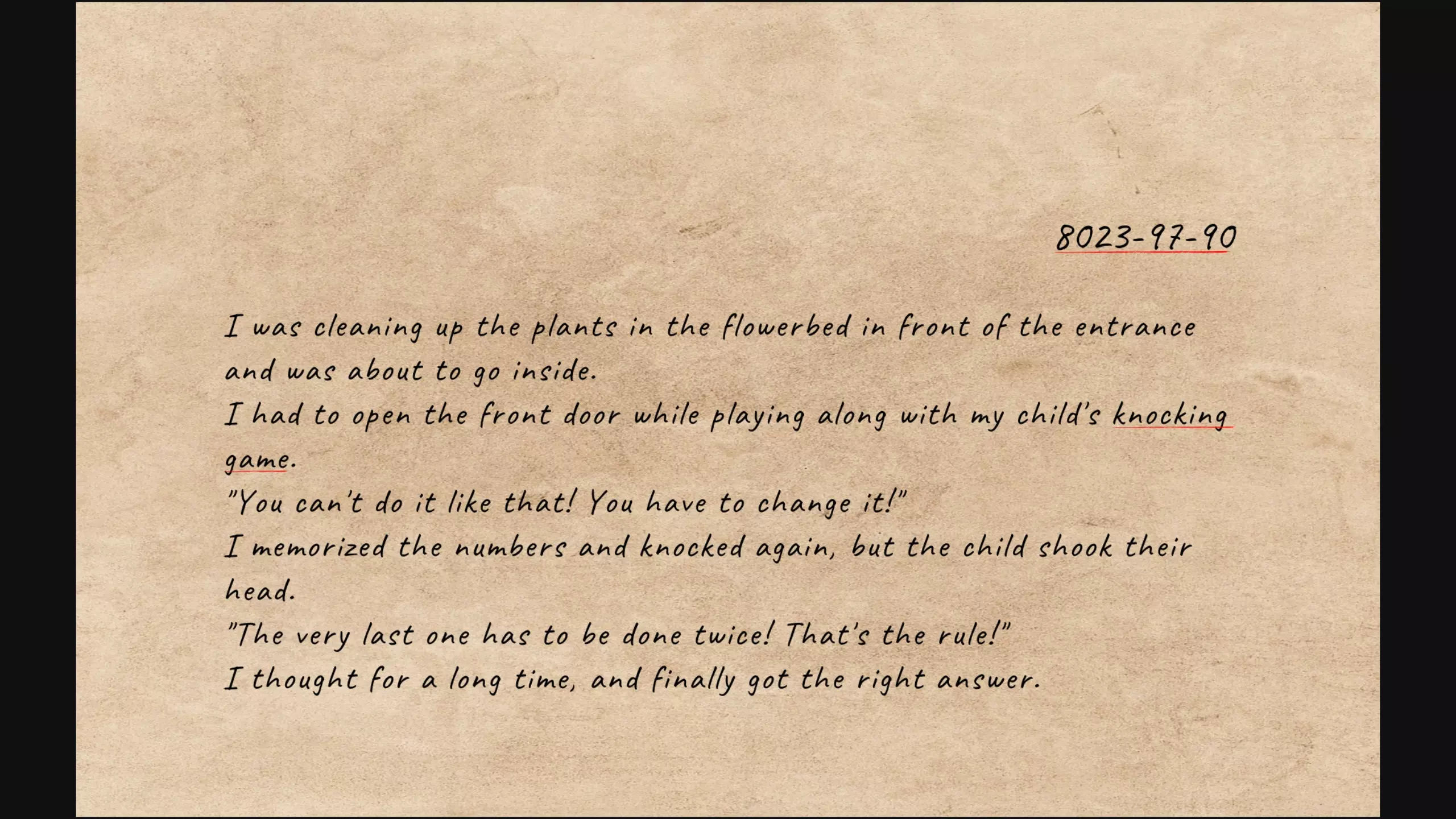 提到了和丽塔玩敲门游戏。日期写的是8023-97-90。上面写着最后一次敲门必须敲两下。