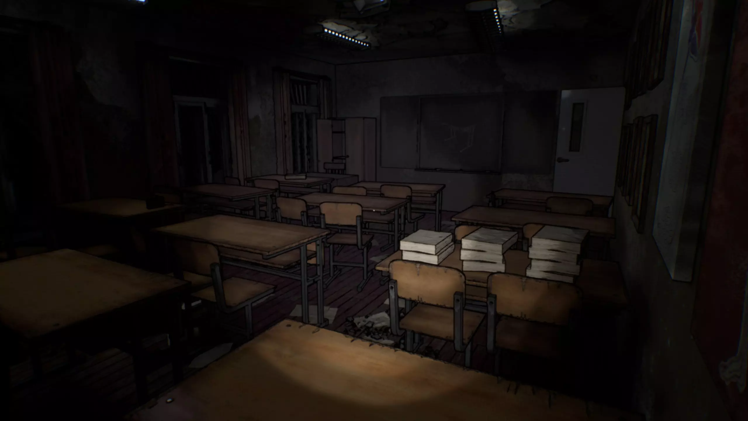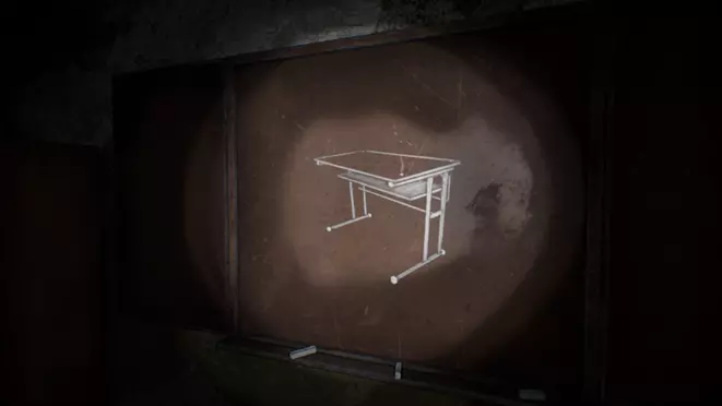 教室黑板上画着一张课桌。 提示1:只有课桌下方的区域被涂上了颜色。 答案:仔细查看每张课桌下方的储物空间,你能找到一张便签。 步骤2:教室衣柜密码