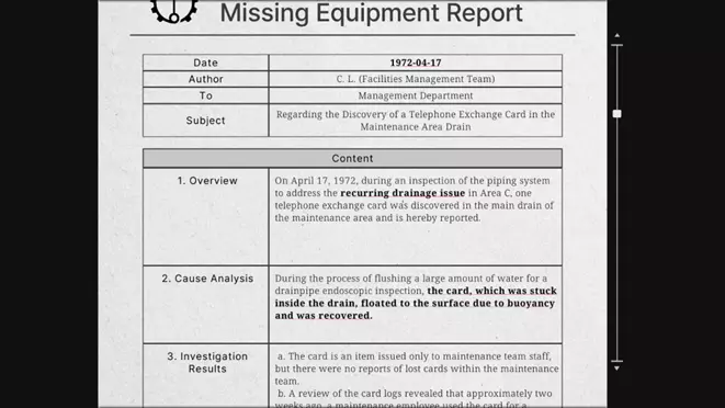 你可以从工厂的钢制储物柜中获得一份关于电话交换卡找回的文件。该文件记录了以下事实: 1972年4月17日发生了一起与排水相关的问题。 电话交换卡会浮在水面上。 提示1:你之前获得的【遗失电话交换卡报告】文件说明了卡片丢失的位置。 答案:在大厅的键盘上输入19720417以触发异常,然后从两个绿色柜子左侧的排水管中取回漂浮的电话交换卡。