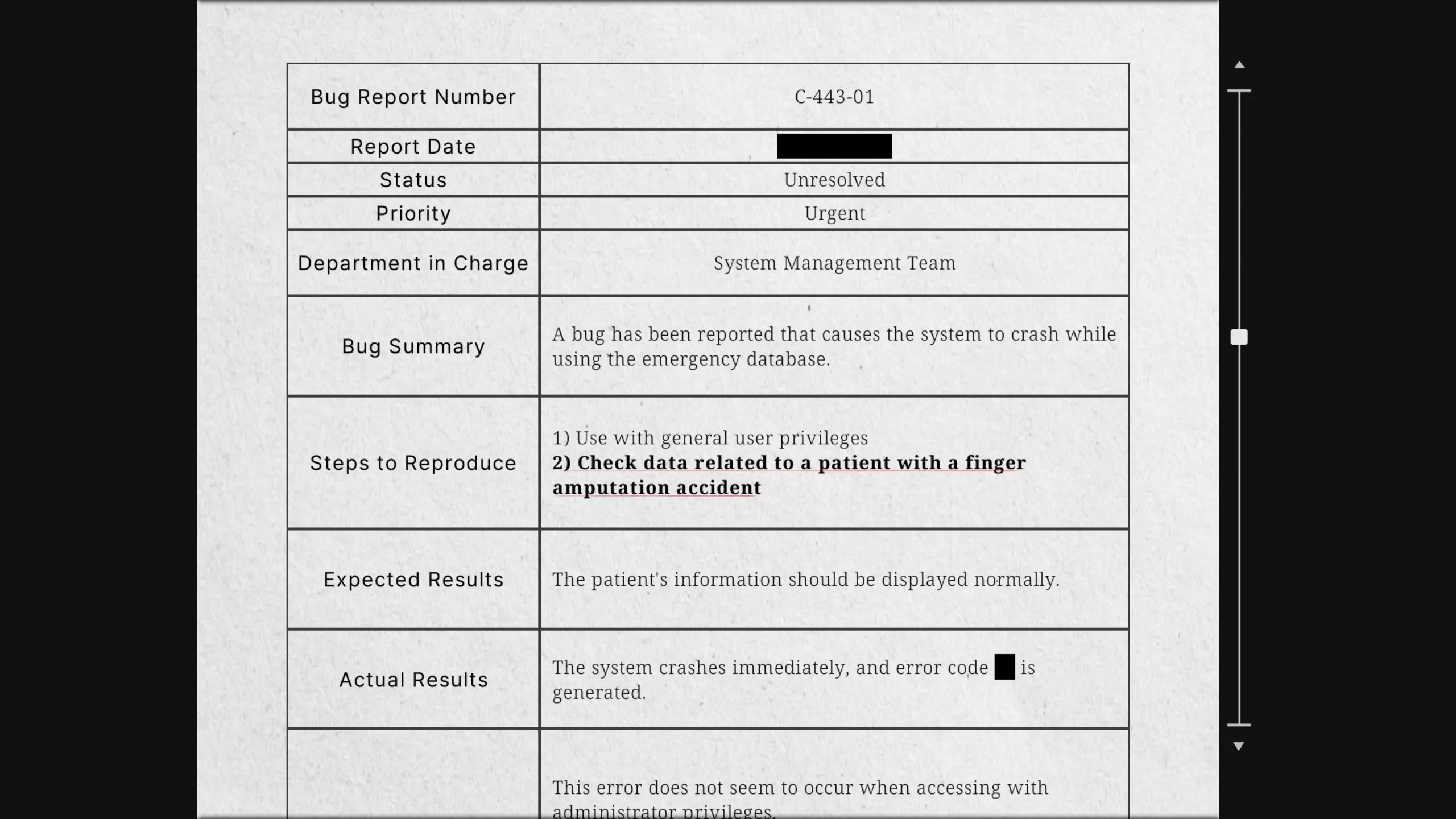 六月,菲尔因妻子的健康问题成为公司里唯一休假的人。 他在医院看到了一位因意外提前下班的同事。 他六月份不能再休假了。 菲尔的电话交换机卡。 你必须将医院数据库错误代码输入中央保险箱。根据医院数据库错误报告文件,只有将断指相关患者的病历号输入数据库,才能重现该错误。