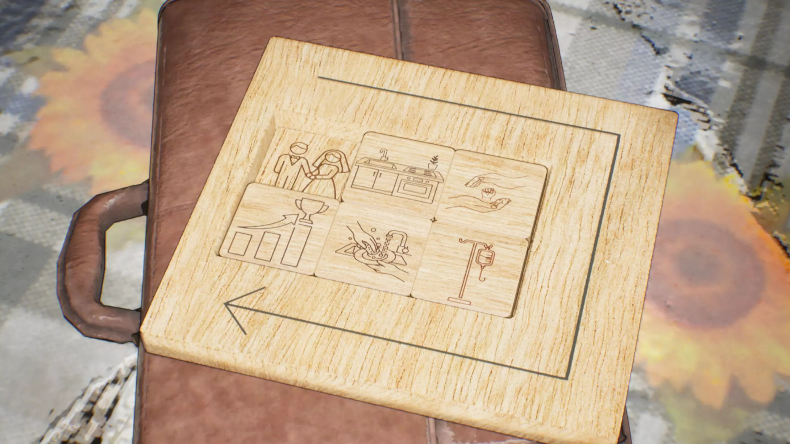 房子的餐桌上有一个木质滑动拼图。每一块拼图都象征着一个特定事件,你必须按照正确的时间顺序排列它们。 答案:每张图片所象征的事件及其时间顺序如下: 图片 含义