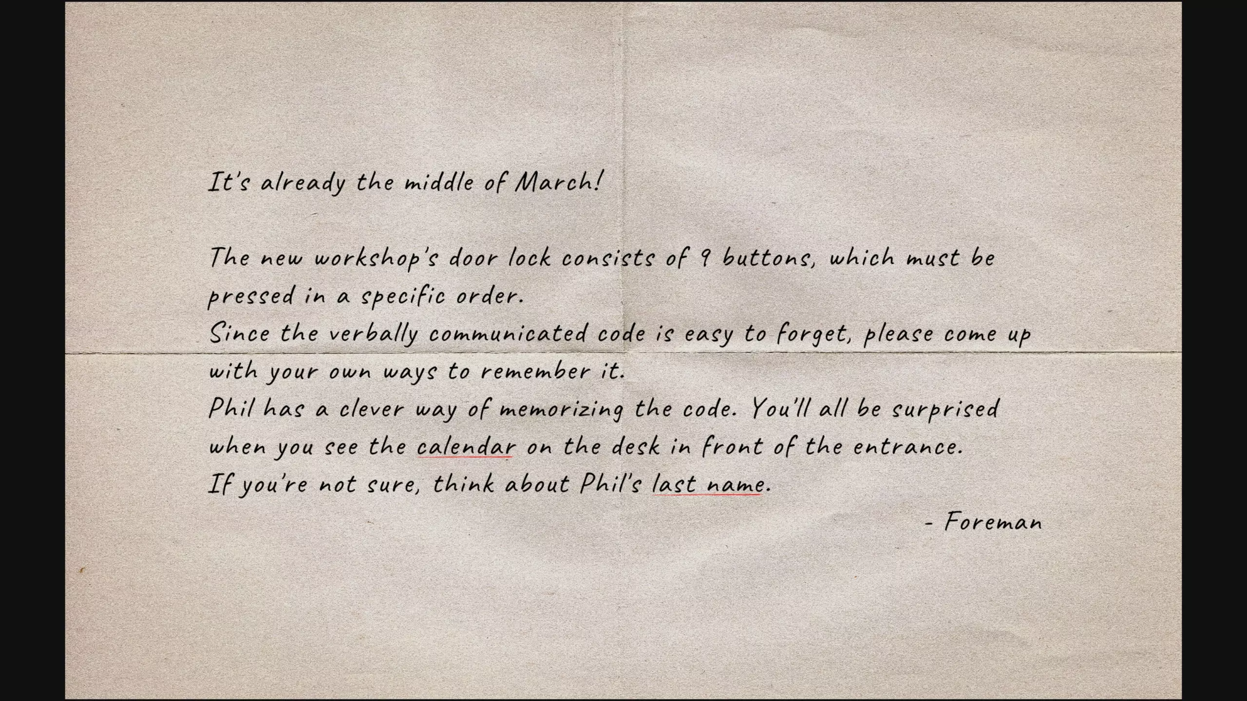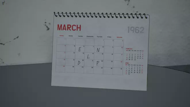 你可以从6201层的储物柜中获得一份文件。文件包含以下信息: 工厂密码键盘需要按照特定顺序按下9个按键中的6个。 菲尔在工厂密码键盘前的日历上用巧妙的方式标记了密码。 要通过这种方法破解密码,你需要知道菲尔的姓氏。