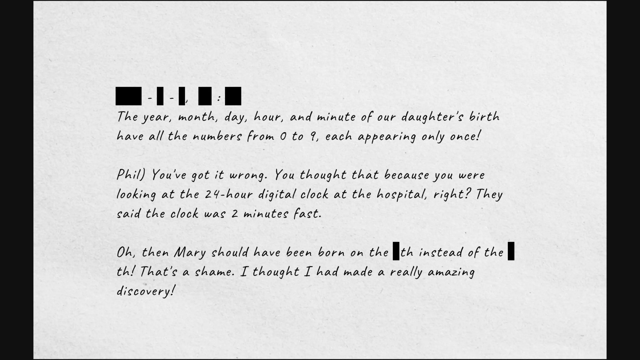 故事中提到,玛丽的生日格式为YYYY-M-D HH:MM,其中0到9这十个数字恰好各出现一次。 丽塔的产科记录文件。 提示1:从丽塔的产科记录可知,她出生于1970年4月前后。你需要将剩余的数字2、3、5、6、8分配到日(D)、小时(HH)和分钟(MM)中。 提示2:小时(HH)必须是23。小时数不能超过24。 提示3:分钟(MM)必须是56或58。分钟数不能超过60。 答案:(根据提示继续推理)已知当时的时间快了2分钟,因此玛丽本应出生在不同的一天。考虑以下每种情况: 如果分钟是56,那么实际出生分钟应为54,这与月份中的数字4重复。因此,这种情况不成立。如果是58分钟,实际出生分钟数就是56,这与日期中的数字6重复了。因此,很自然地可以说她本应出生在8号而不是6号。所以,玛丽的生日是1970年4月6日。【异常:坠落玩偶】的数字以1976开头。输入19760406(玛丽生日的1976年日期)即可获得玩偶,然后将其放入盒子中以打开房间门。房屋滑动拼图