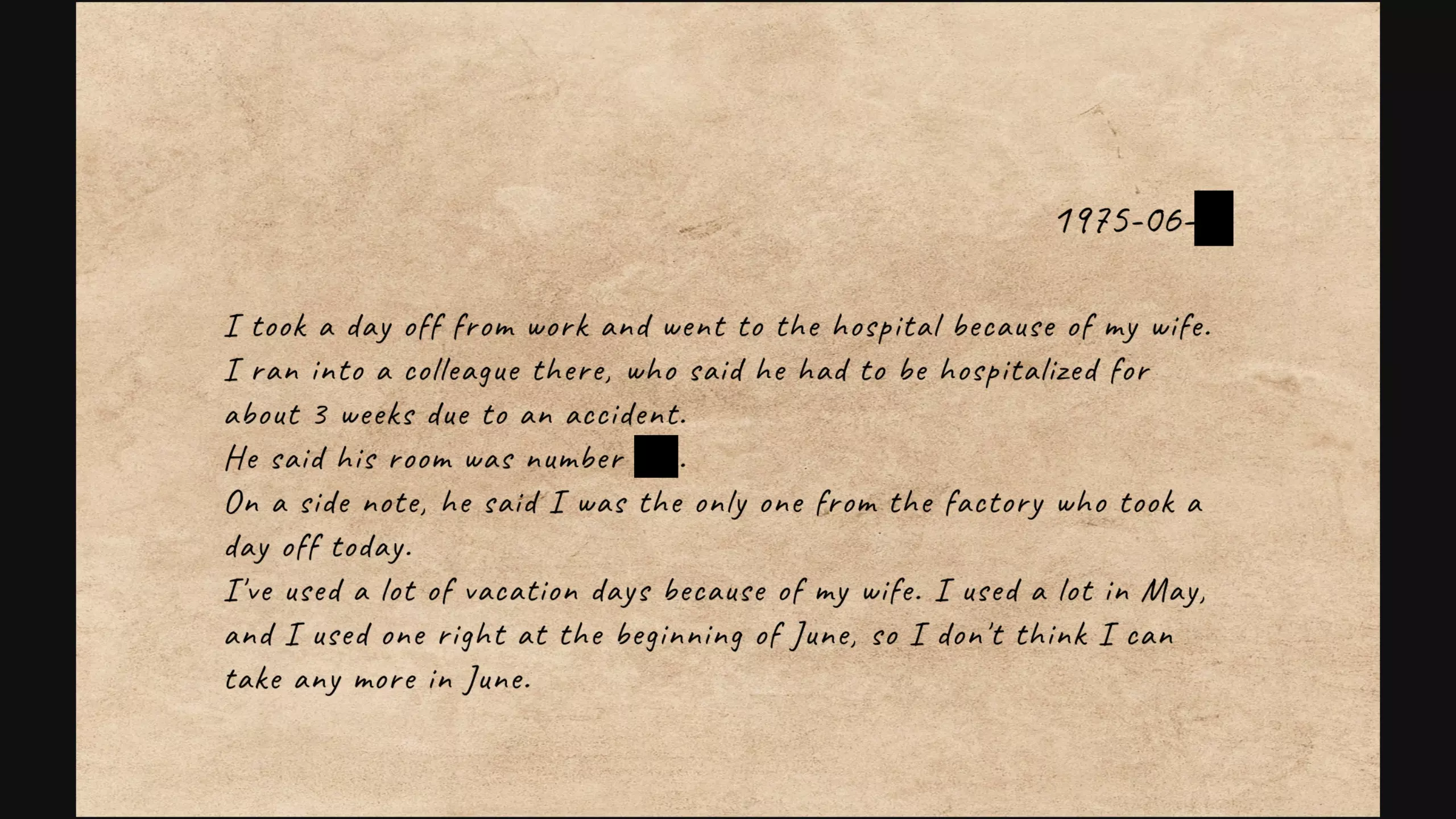 你可以在第一步获取【请假审批清单】文件。该文件是一份关于六月份请假情况的清单,你能在上面找到菲尔·彭德尔。 提示1:你可以推断出N.哈维是因意外提前离岗的同事。 提示2:菲尔·彭德尔的最后一个工作日是6月2日,他因请假在6月3日没有来上班。此后,打卡机出现故障,同时发生了断指事故。因此,你可以确定N.哈维就是断指事故的当事人。 答案:你可以在医院患者图表中找到N.哈维。在医院数据库中输入7013以重现错误。错误代码为12;将此代码输入中央保险箱。医院右侧保险箱 医院右侧的保险箱需要输入1975年丽塔的年龄,也就是菲尔休假、和丽塔一起去医院并遇到同事N.哈维的那天。 你可以从医院中央保险箱获取一份关于癌症患者前期症状的文件。