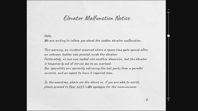 课桌下的纸条包含以下信息: 密码藏在实验室人体模型后面。 提示1:人体模型存在异常现象。 提示2:仔细观察人体模型的背部,上面写着数字6561。 提示3:有文件记录菲尔习惯把数字写倒。 答案:教室衣柜的密码是1959。 电梯故障通知 你可以从教室衣柜中获得电梯故障通知。 答案:在电梯内按顺序按下6、2、10、1楼层按钮,然后按下关门键。 6201楼层的储物柜