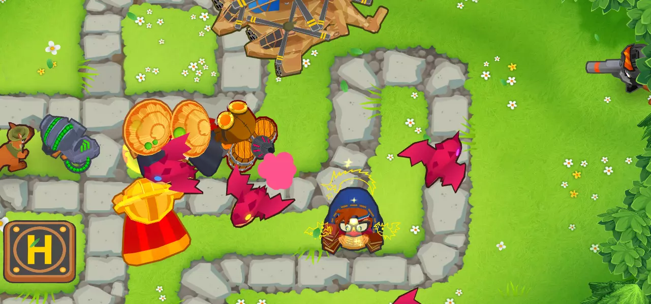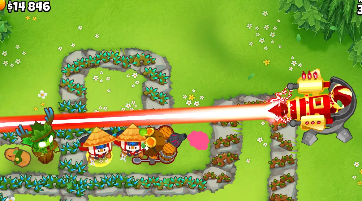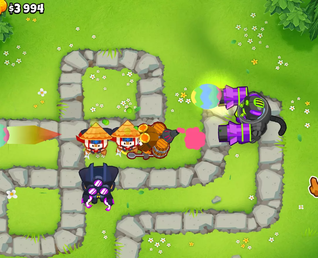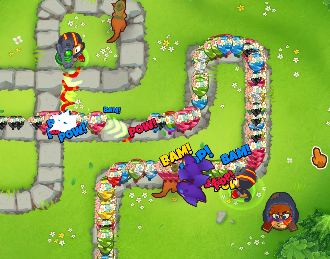 在使用艾蒂安的组合后,我会利用这个增益效果来使用那些本身无法探测迷彩气球且这是它们唯一缺点的猴子。 这是我游戏结束时的情况:
