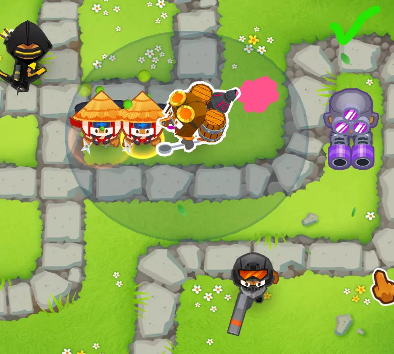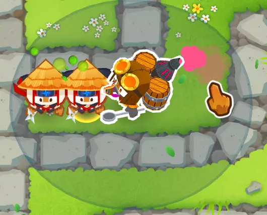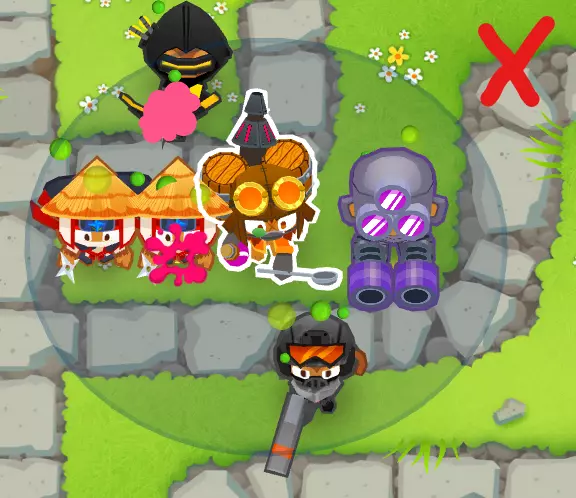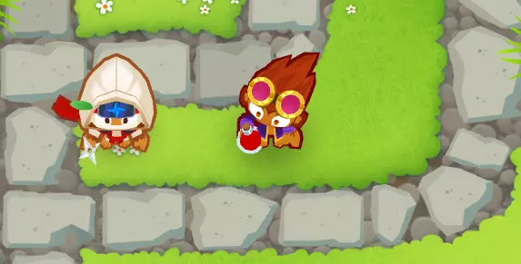 解释:这种组合效果很好,因为【炼金术士42x】能提供更强的攻击力、穿透力、攻击范围和攻击速度。它与【忍者4x1】搭配效果出色,因为忍者会投掷5枚手里剑,炼金术士的增益效果会作用于每一枚飞镖,从而形成强大的组合。 凭借这个组合,你足以撑到攒出非常强力的塔。 你需要知道的技巧: 炼金术士的范围:炼金术士要想给猴子们施加增益效果,那些猴子必须在他的攻击范围内。