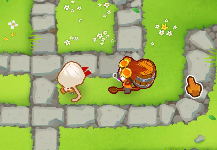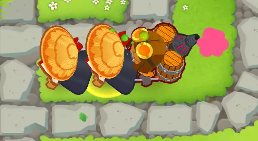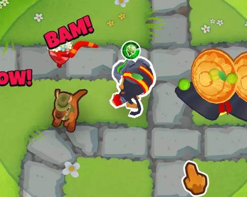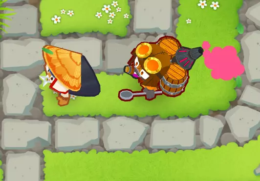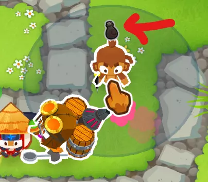实际上在整个地图上,与奥本不同,艾蒂安能给所有猴子提供增益效果,而且不管这些猴子是否在他的射程范围内(可以看到那两只回旋镖猴子都能攻击迷彩气球,不管它们和艾蒂安之间的距离如何)
