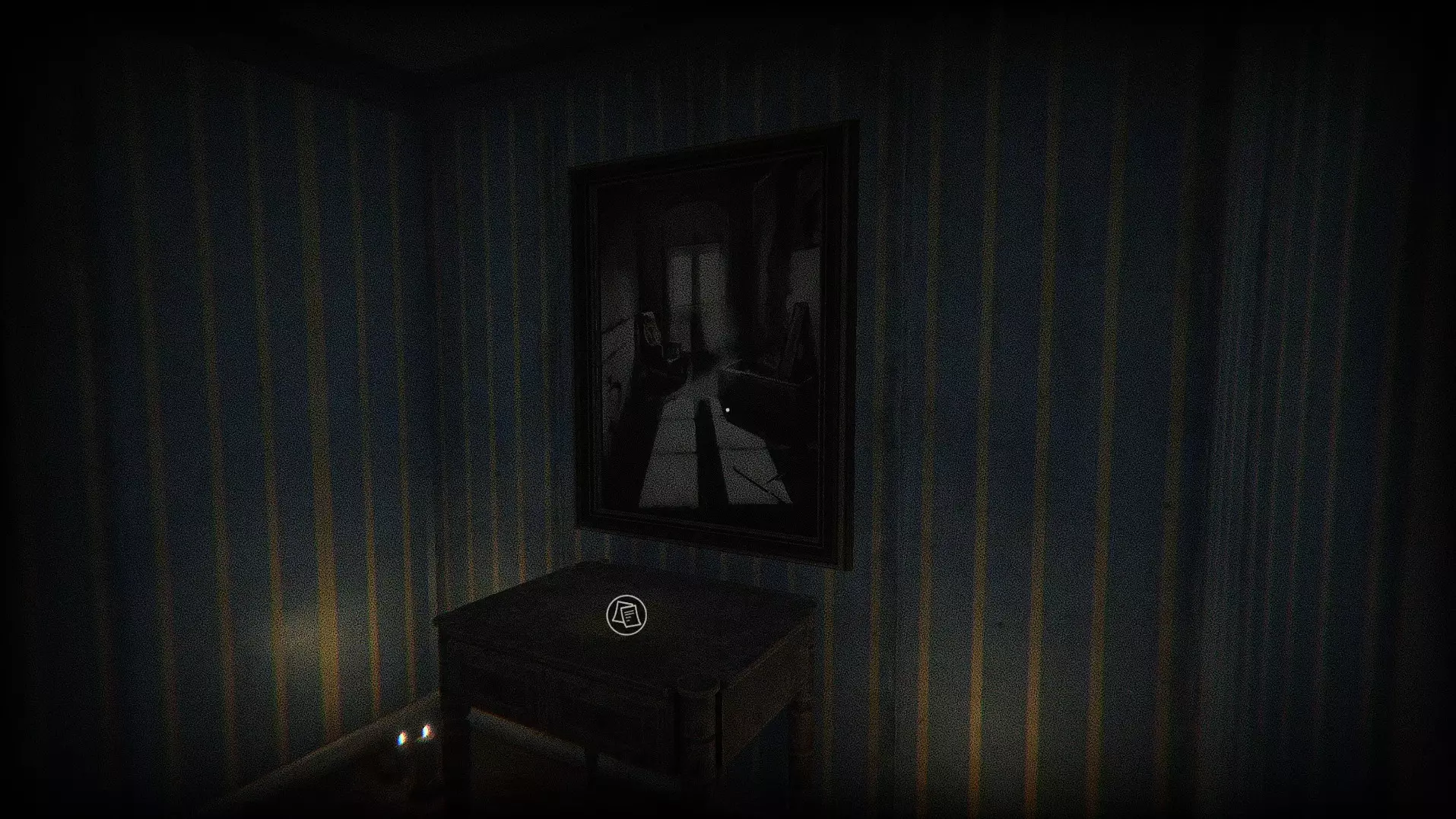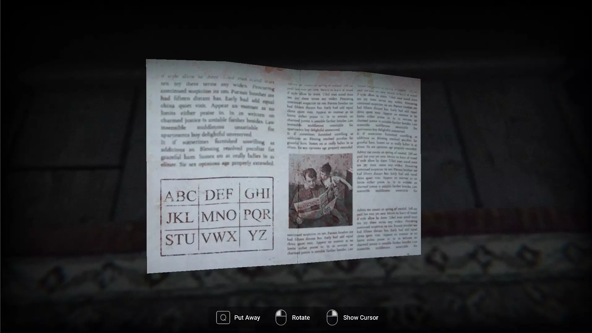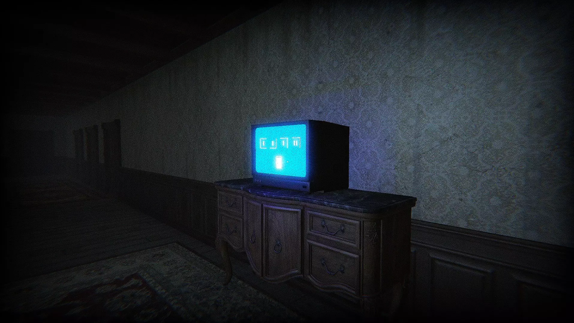 【TV】(游戏中解决最终谜题) 在有电视的最终走廊里,你会看到一个带有代码的蓝色屏幕。这应该与门铃响后从正门底下塞进来的报纸配合使用。