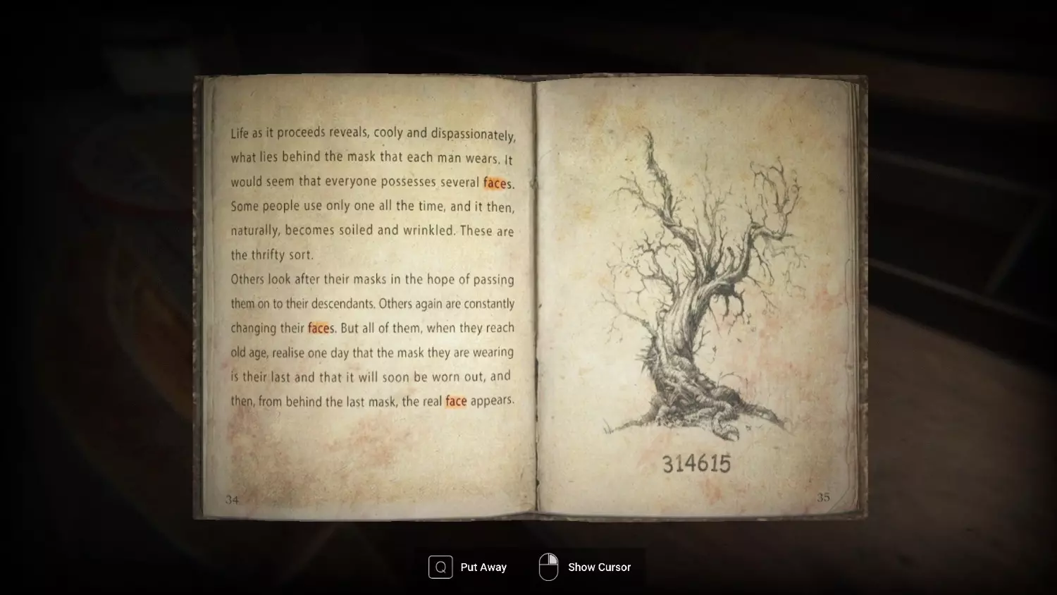 视频时间戳位置如下。 宅邸(在宅邸解开 puzzle box) 在之前那幅画下方的抽屉组最上层抽屉里,放着第一个带锁的箱子。它需要一个3位数字密码。这个密码可以通过阅读小圆桌上电话旁的便条获取。便条背面有以下提示…… 3:FACE ?:AND ?:MASK 如果你阅读左侧桌上的书,会看到书中“FACE”一词被高亮显示了3次。基于此,只需数出文本中“AND”和“MASK”出现的次数即可。