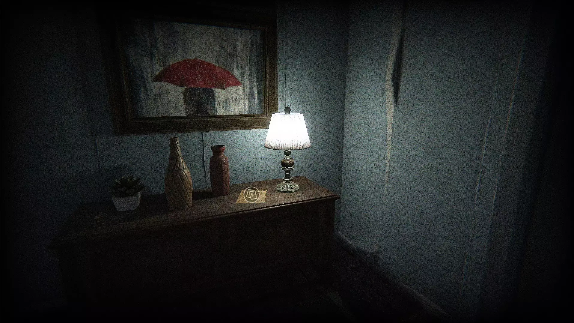 秘密物品(伙伴图片) 解锁门后进入下一个房间,检查门口右侧墙上的椭圆形图片。