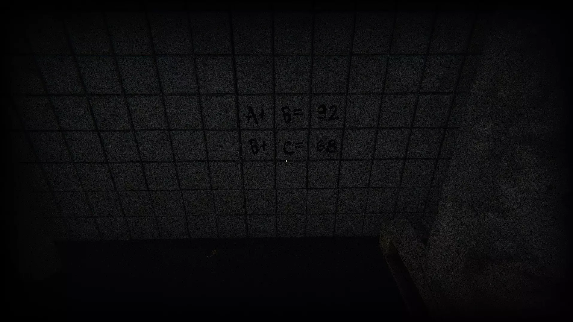 右手边的房间里,远处的墙上写着两道计算题。利用你从之前房间获得的提示,现在应该能算出最终房间的密码了。