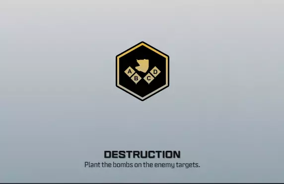 破坏模式 该游戏模式中,双方队伍各需防守和攻击2个炸弹。你的团队将分为两组,一组负责防守,另一组尝试进攻。当任意一方的两个炸弹都被引爆时,引爆炸弹的队伍获胜。