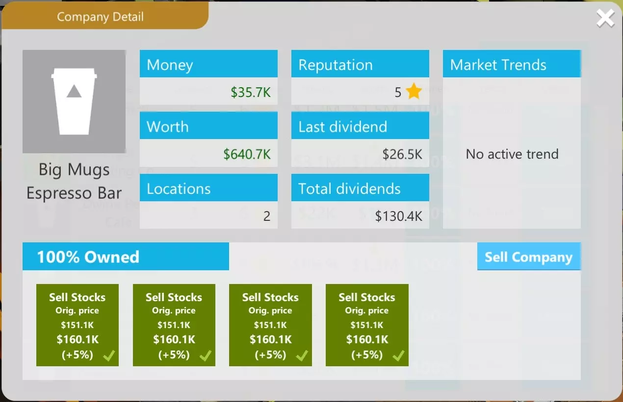 Ingot Roasting Co.列表中的企业按时间排序,新企业会添加到滚动列表的最底部。点击最右侧的【详情】可查看企业详情并进行股票买卖。