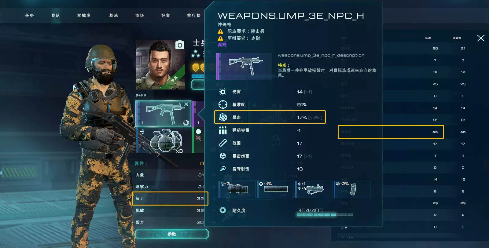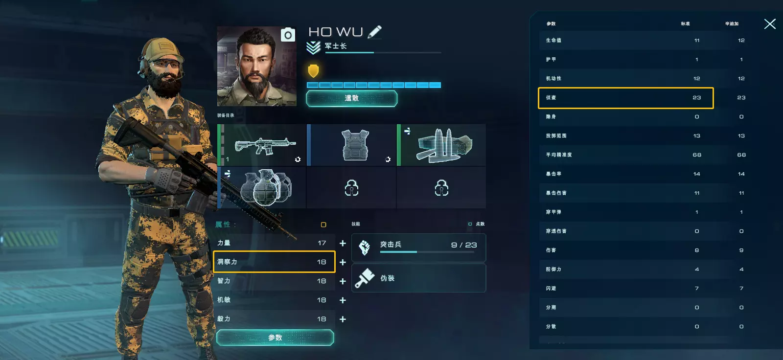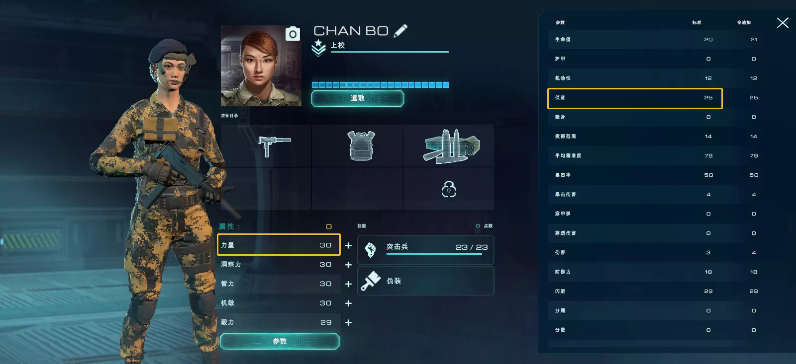 【侦查半径】指雇佣兵能够侦查到敌人的空间范围。 部分玩家可能不太理解侦查与隐身机制,下面结合两者进行简单说明: 只要对手出现在我方雇佣兵的侦查半径内,或我方出现在敌人的侦查半径内,侦查就会发生。 侦查半径通常为20格,但敌人可通过提升隐身属性或使用扫描仪来影响侦查效果。 隐身属性会缩短敌人侦查到你的距离,敌人的侦查半径最大可降低8格。 若敌人出现在你的侦查半径内,而你未进入对方的侦查半径,则战斗回合由你方开始;反之亦然。即便你的雇佣兵直接冲向敌人,双方的隐身属性和侦查属性也会进行比较,更隐蔽的一方将先开启回合。如果你和对手的侦查半径相同,回合将随机从一方开始。 回合中后行动的玩家会获得一点免费行动点用于移动战士,该行动点仅可执行移动操作。 属性:智力 智力:提升暴击几率。具体为每4点智力增加1%暴击率。 差别如下: 该雇佣兵智力为32,暴击率计算:17(武器)+32/4(属性)+20(技能)=45(关于暴击叠甲的说明,可见文末)