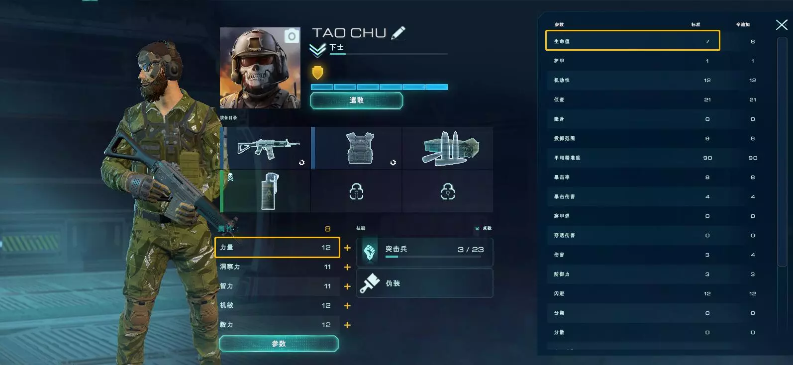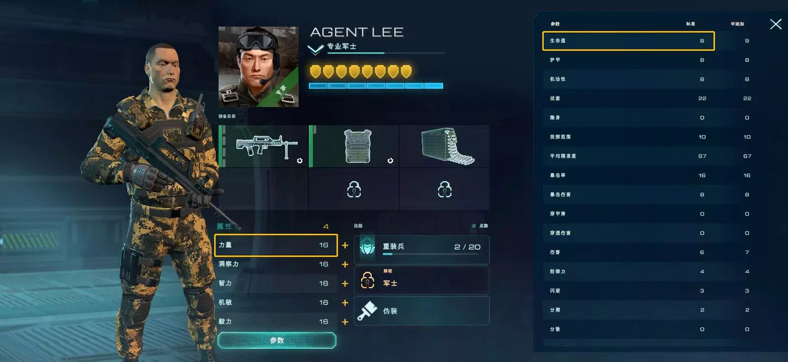 4. 社交系统 社交系统主要包括军团系统和好友系统。无论是连接多人的军团系统,还是连接单人的好友系统,都扩展了社交体系,让玩家们能够共同交流作战经验,邀请完成合作类任务。 社交玩法包括: 【军团PVE】:军团在随机地图上选择不同难度对抗机器人。 【COOP H(军团PVE合作困难模式)】:军团PVE合作困难模式。 【PVP】:玩家与玩家之间进行对抗的竞技入口。每天晚上19-24点开放。 属性介绍 《全球戒备》的雇佣兵拥有力量、洞察力、智力、机敏、毅力五种属性。玩家可以自由选择加点,培养不同方向的雇佣兵。 属性:力量 力量:增加生命值(HP)。具体为:每4点力量可增加1点HP。差别如下图,该雇佣兵的力量为12,生命值为:3(基础HP)+12/3(属性)=7