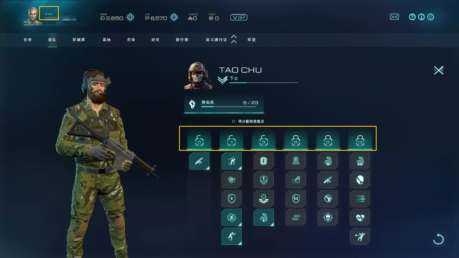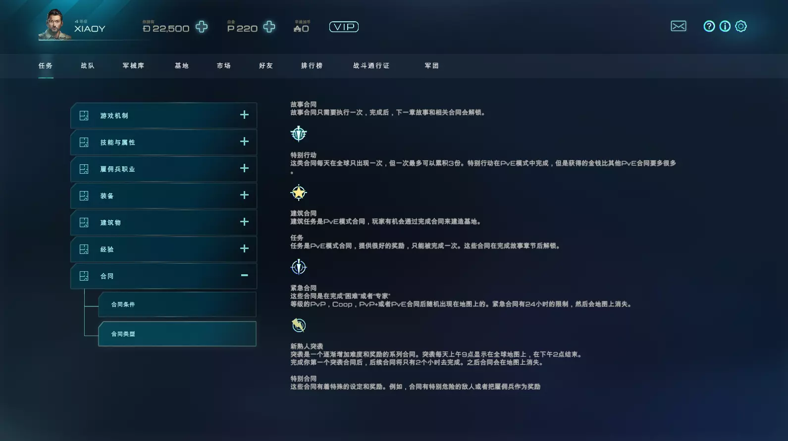系统功能【任务】主要展示游戏“合约”“任务”相关的系统功能,玩家作为雇佣兵需要领取任务,完成合约,获得D币、装备道具、士兵经验值等奖励。 【战队】能够查看和管理自己拥有的士兵系统,在执行合约任务中,能够组织士兵队伍、士兵装备、士兵属性、士兵技能等策略,让自己更好的完成任务,给士兵更换心仪的皮肤也在这个系统完成。 【军械库】自己的背包系统,能够查看已经获取的“武器”“护甲”“弹药”“耗材”“弹药箱”等道具。 【基地】提升雇佣兵科技水平的系统,消耗游戏币能够建造:“运营总部”“科研中心”“飞机棚”“军营”。完成各个建筑的任务,能够提升雇佣兵基地的科技水平。 【市场】商城系统,能够购买游戏中玩家需求的装备道具。 【好友】好友系统,能够添加好友,在游戏中合作完成任务。 【排行榜】排行榜系统,能够查看每个赛季自己的赛季排名以及赛季的冠军。 【战斗通行证】通行证系统,通过完成每日或每周挑战可获得战斗通行证经验值,提升经验值能够获取通行证奖励。每个赛季倒计时结束时,战斗通行证奖励内容将重置。赛季周期为28天,每28天奖励刷新。 【军团】军团/公会系统,玩家加入军团能够完成军团任务,参加军团PVP与COOP玩法。3日常【重复挑战】重复游玩主线任务的系统。 【每周挑战】完成每周挑战任务能够获得通行证经验奖励。 【每日挑战】完成每日挑战任务能够获得通行证经验奖励。