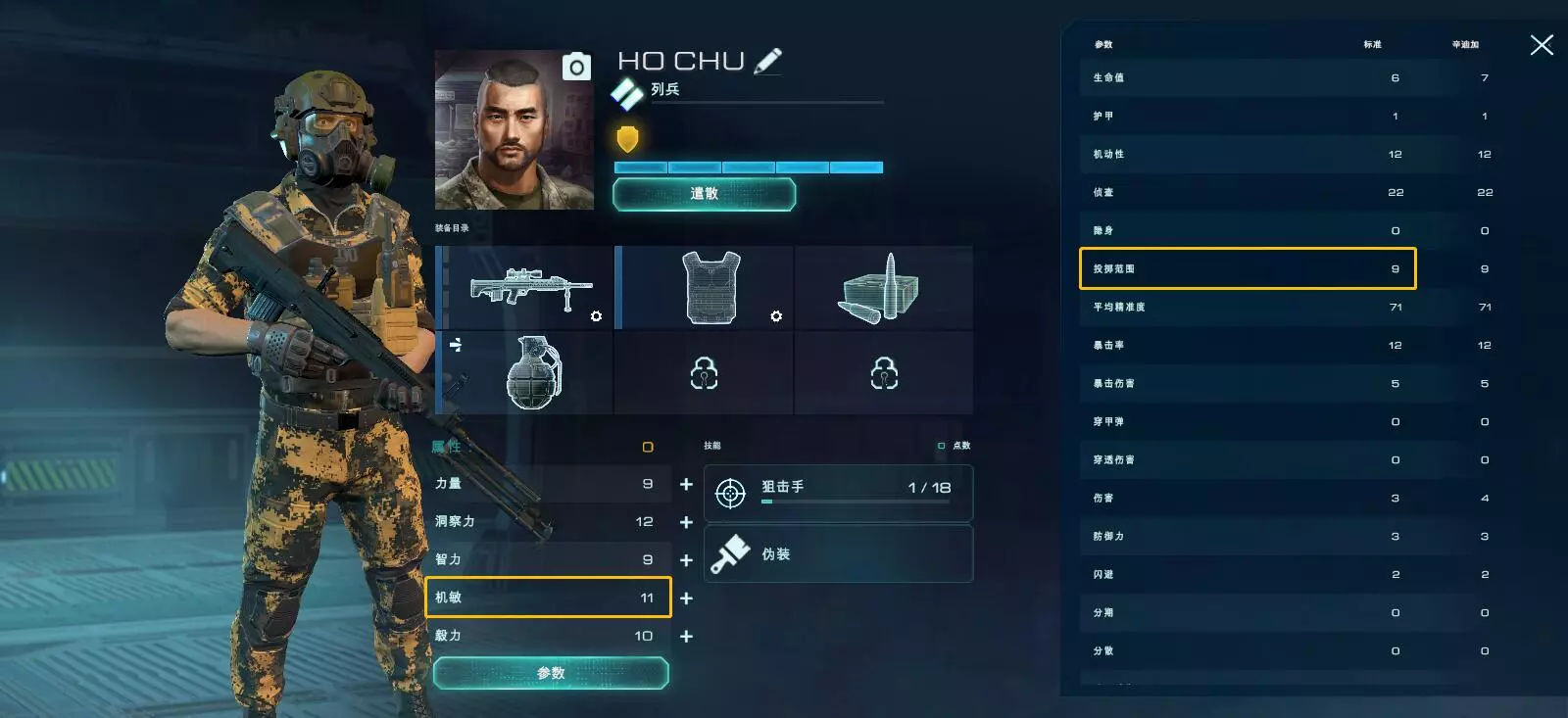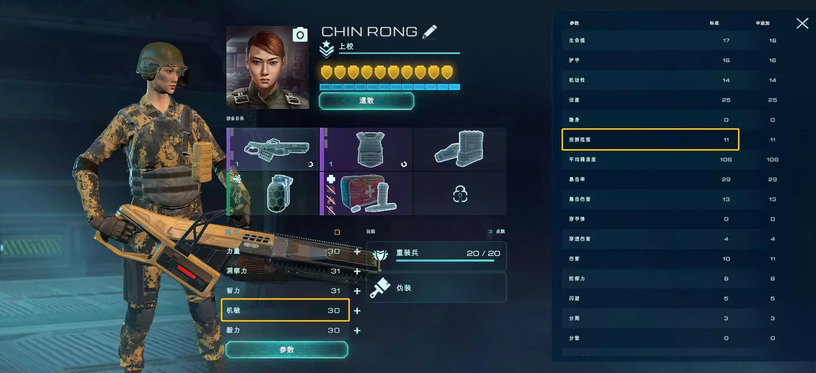 【暴击几率】:造成强化伤害的几率,与【暴击伤害】统计数据有关。暴击概率取决于武器,然后会叠加到雇佣兵的技能和武器模块中。 【暴击伤害】:暴击造成的伤害量。暴击伤害取决于武器,并与武器模块和技能叠加。 【属性:机敏】 机敏:增加投掷手雷和扫描仪的距离。具体为:每8点机敏值可让道具投掷范围增加1个单元。 差别如下:该雇佣兵的机敏为30,投掷范围为:8(基础范围)+30/8(属性,仅保留整数)=11