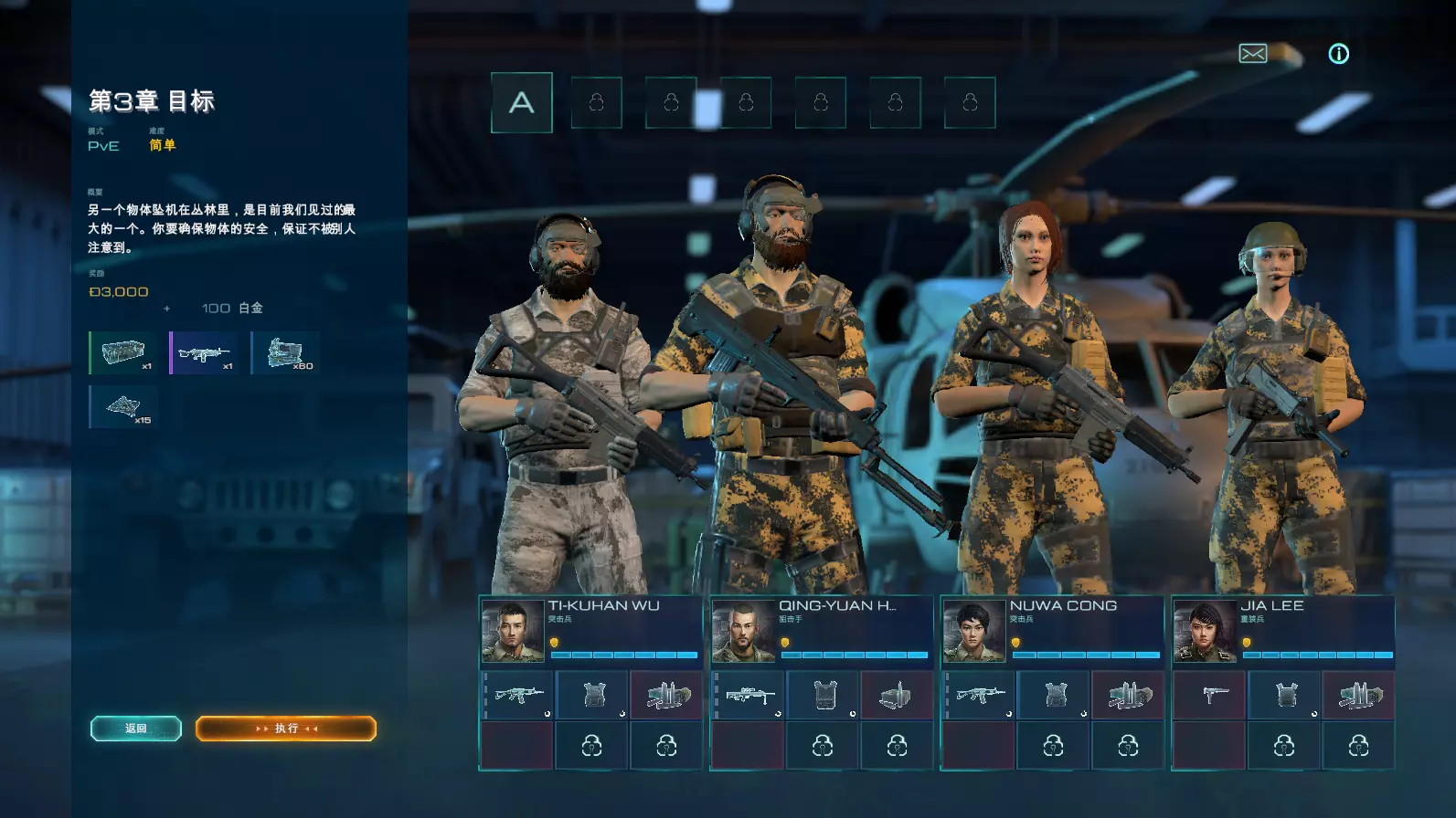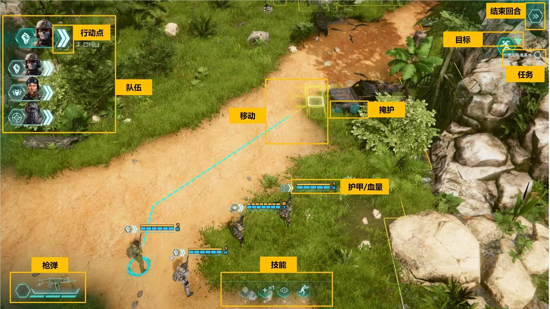 掩护仅在雇佣兵前方180度半圆内提供闪避奖励。 如果你从侧翼或背后向目标开火,目标的掩护奖励将被忽略。 一些掩体可以被爆炸性伤害摧毁(如破片手榴弹、榴弹发射器和技能)。 如果投掷武器落在掩体前面而雇佣兵在掩体后面,掩体可以保护你免受爆炸伤害。在这种情况下,他们只会受到投掷弹伤害的50%。 即使爆炸把掩体炸毁,掩护也可以保护你免受爆炸伤害。 队伍每次作战队伍共有4人,先后排序是根据战前准备规定。 每一个雇佣兵的组合为:兵种、雇佣兵头像、行动点点数、雇佣兵名称。 点击头像,镜头会自动切换为以该士兵为地图中心点。