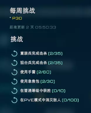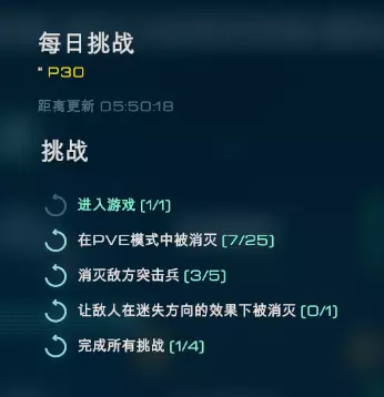 【每日挑战】主要内容包括:进入游戏、在PVE模式下消灭敌人的次数、消灭固定兵种的次数、在固定战斗效果中消灭敌人的次数以及完成挑战的次数等。