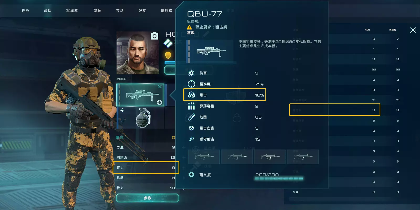 该雇佣兵的智力为9,暴击率为:10(武器)+9/4(属性,仅保留整数)=12
