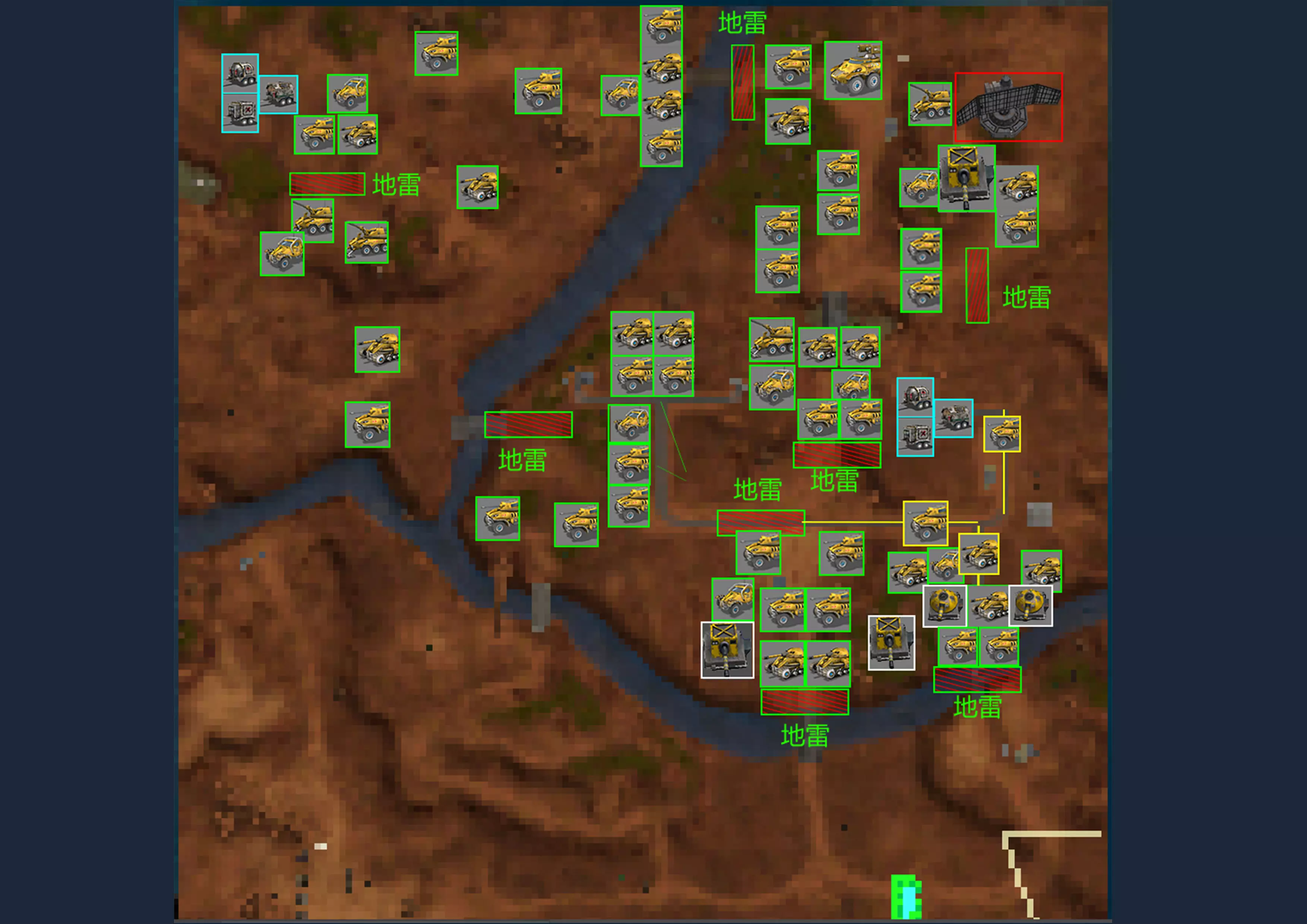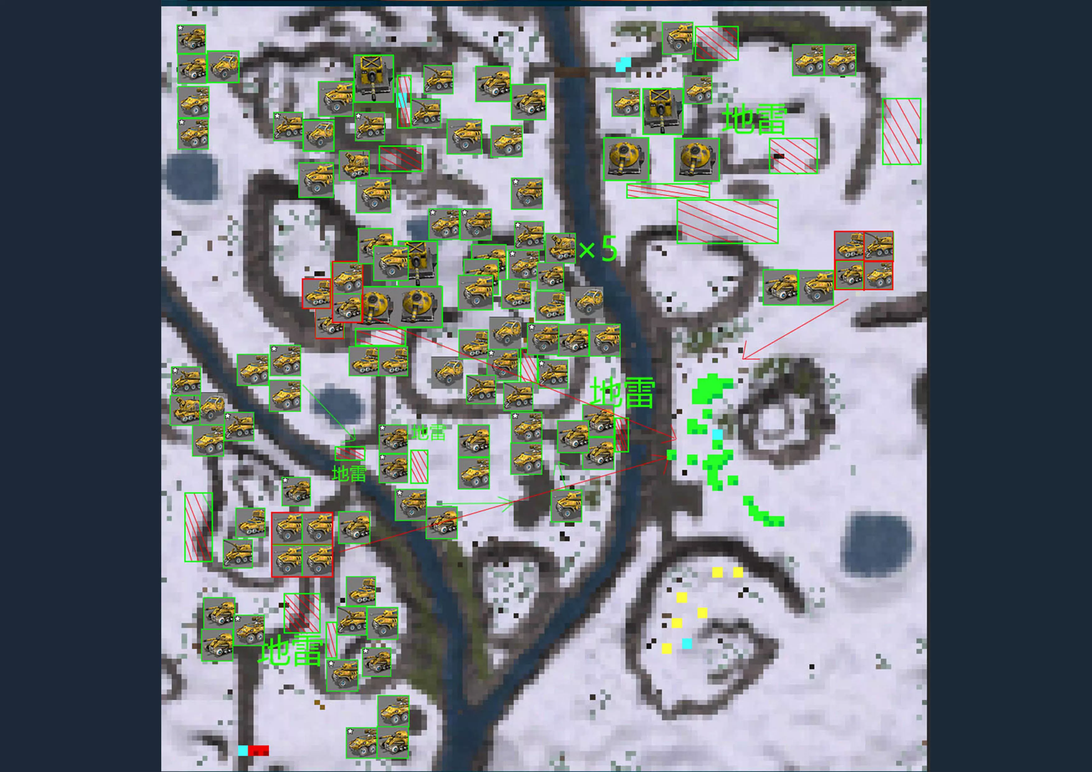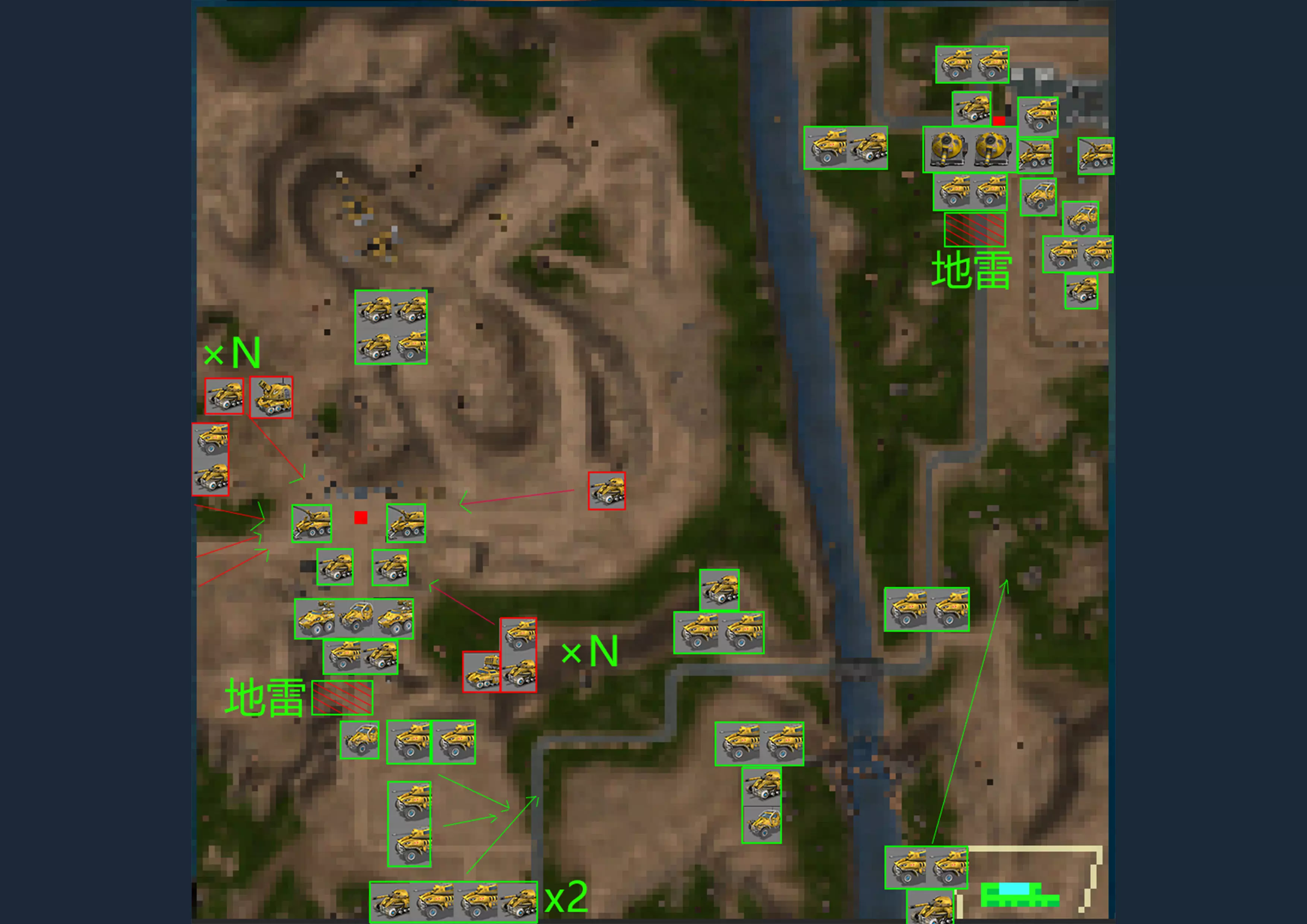 碾压者--碾肉机 耐久度:120 视野:7 最大射程:5.5 弹药量:40 破坏力:14 射击频率:6.5 前部装甲:3 后部装甲:2 两侧装甲:2.5 顶部装甲:2.5 底部装甲:0 燃料量:100 燃料消耗值:15 速度:30 造价:650 特殊能力:可以收回炮管以减少敌人炮火对自己的伤害。 野猪战役 敌军分布图 难免会有出入,给个参考,密恐慎入,看不清点击看大图 第一关