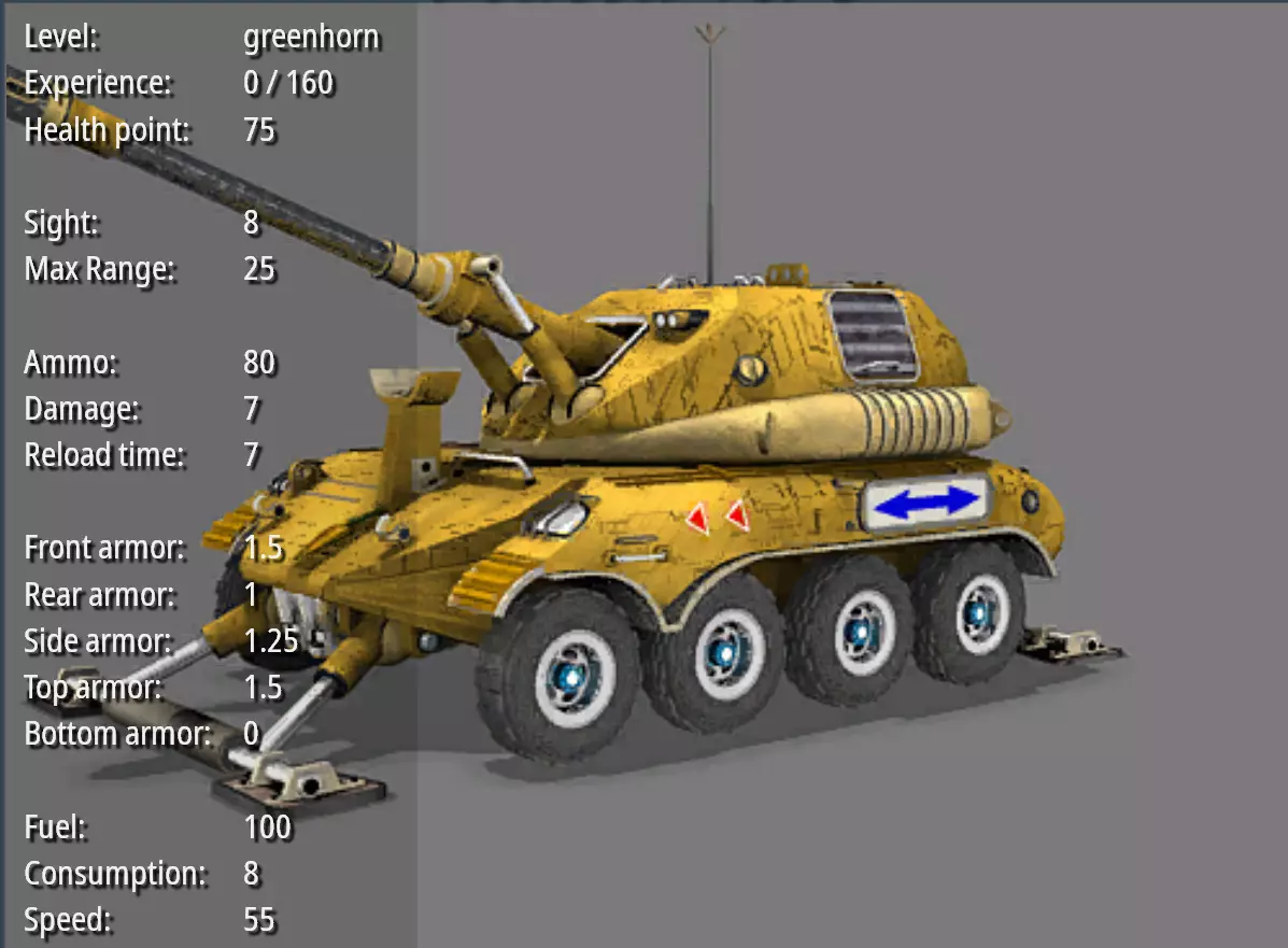 坦克杀手--野兔 耐久度:75 视野:10 最大射程:10 弹药量:60 破坏力:8 射击频率:5.5 前部装甲:1 后部装甲:0.5 两侧装甲:0.75 顶部装甲:1 底部装甲:0 燃料量:100 燃料消耗值:9.1 速度:65 造价:600 特殊能力:攻击自带追踪效果。
