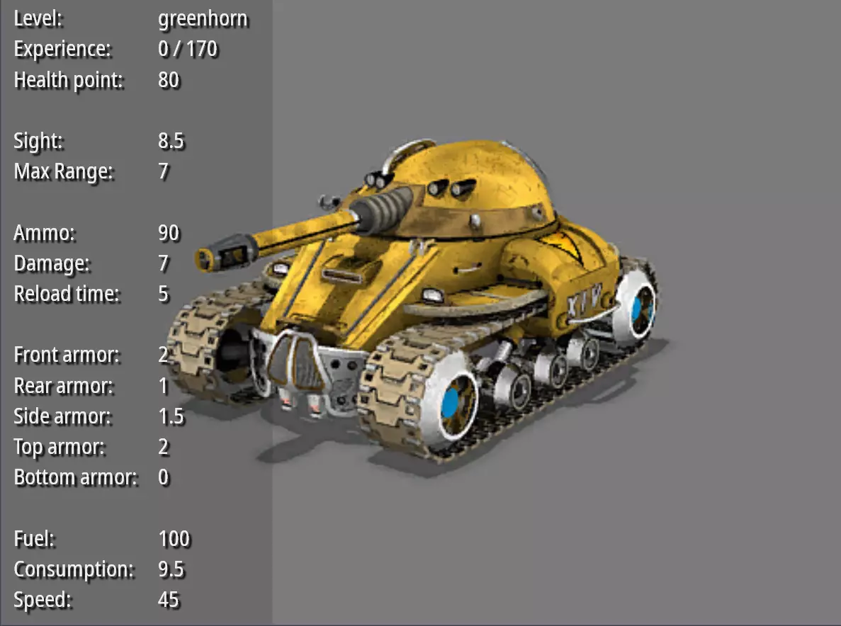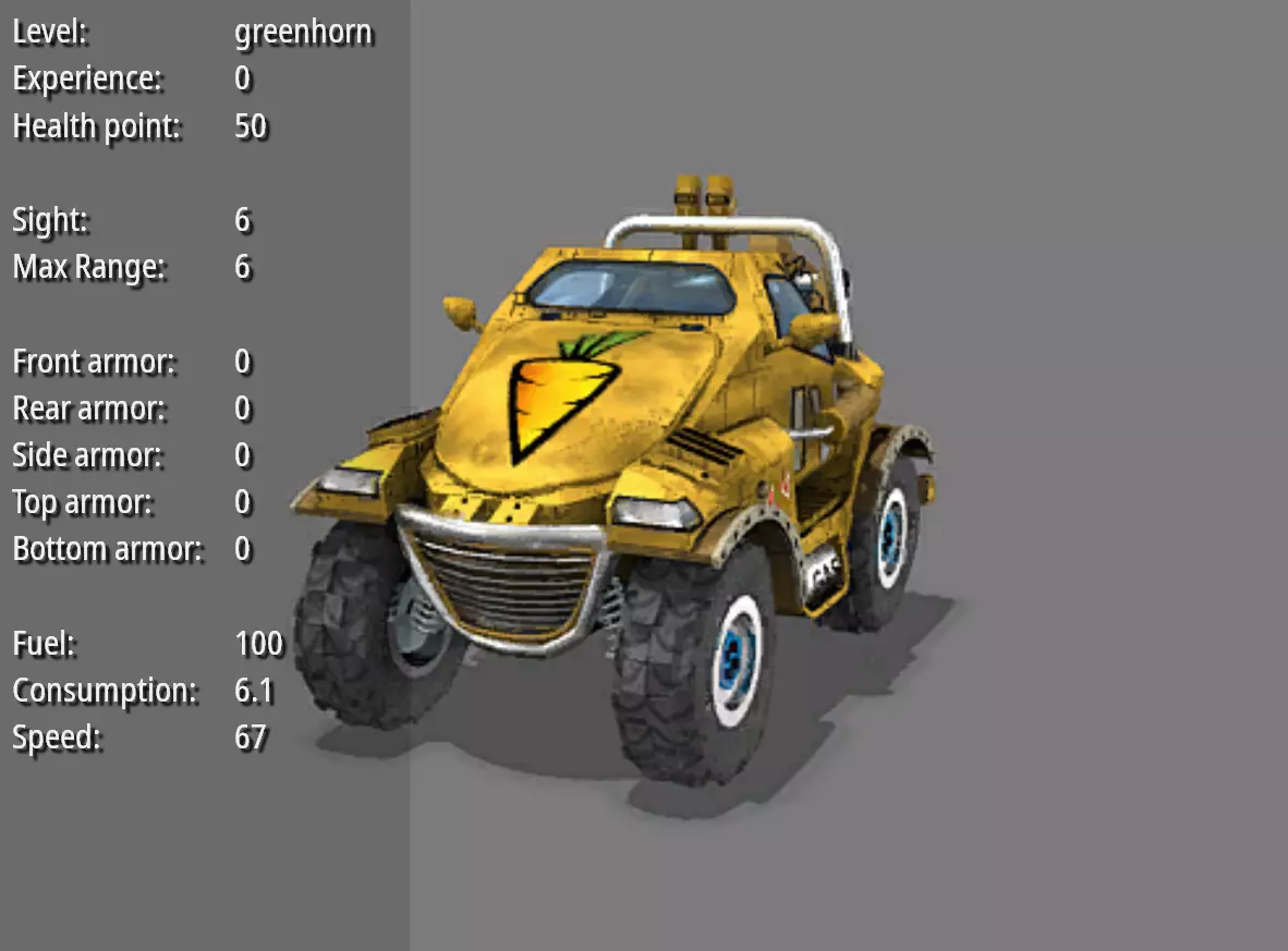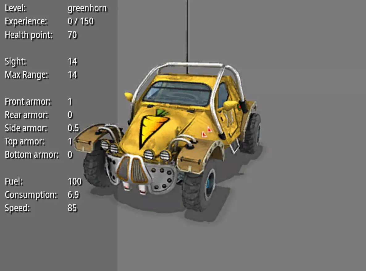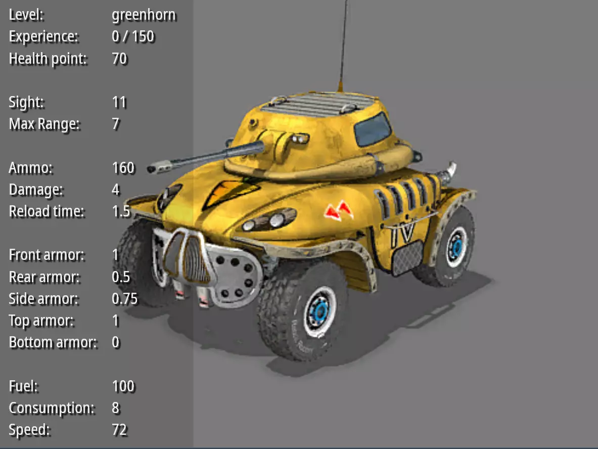 侦察战车--刺探者 耐久度:70 视野:11 最大射程:7 弹药量:160 破坏力:4 射击频率:1.5 前部装甲:1 后部装甲:0.5 两侧装甲:0.75 顶部装甲:1 底部装甲:0 燃料量:100 燃料消耗值:8 速度:72 造价:300 特殊能力:可以穿越水面。