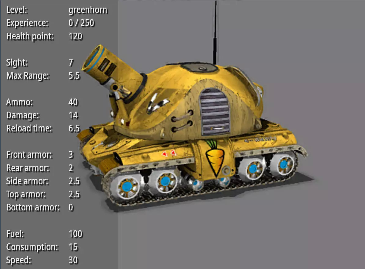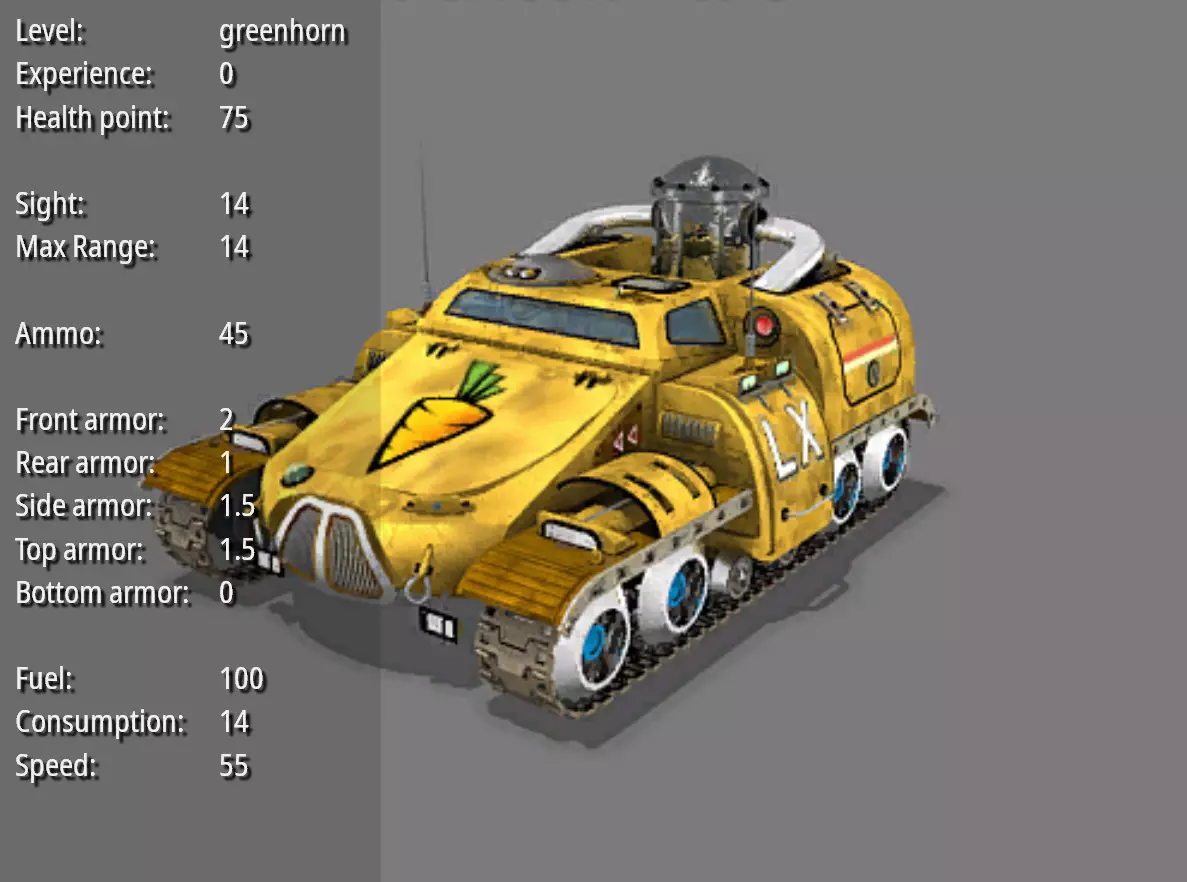 火炮--胡萝卜吊炮 耐久度:75 视野:8 最大射程:25 弹药量:80 破坏力:7 射击频率:7 前部装甲:1.5 后部装甲:1 两侧装甲:1.25 顶部装甲:1.5 底部装甲:0 燃料量:100 燃料消耗值:8 速度:55 造价:500 特殊能力:支起/收回火炮。 兔子战车一览P2