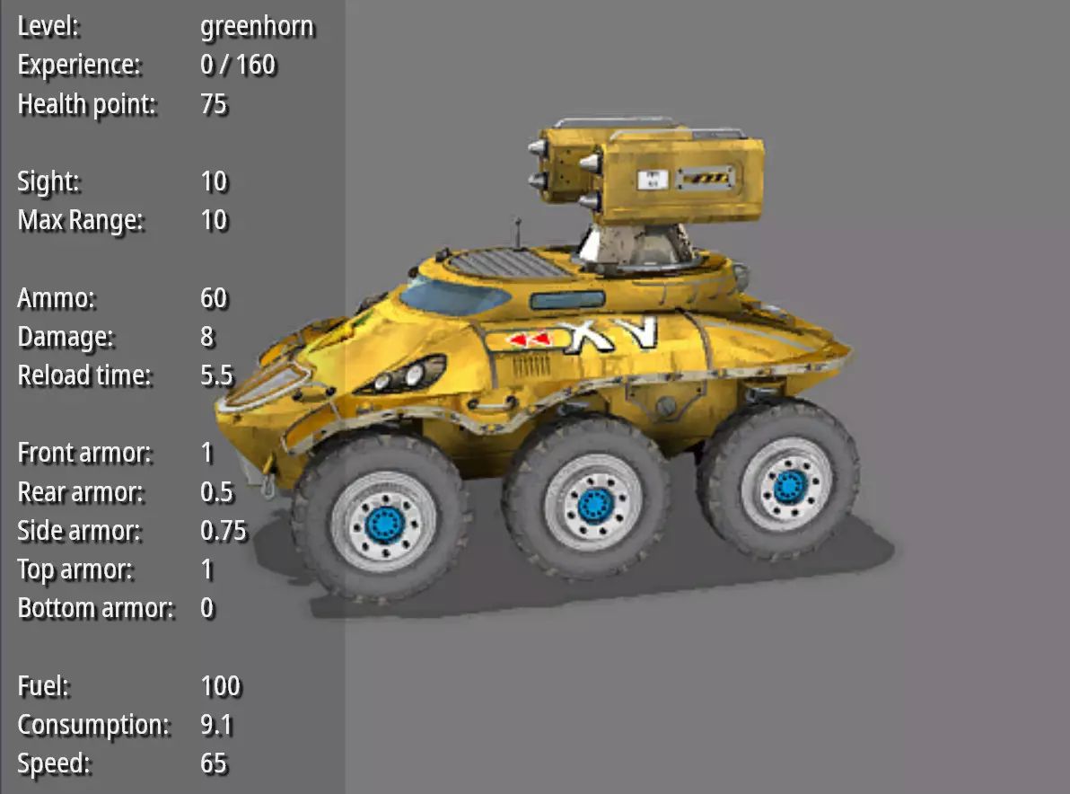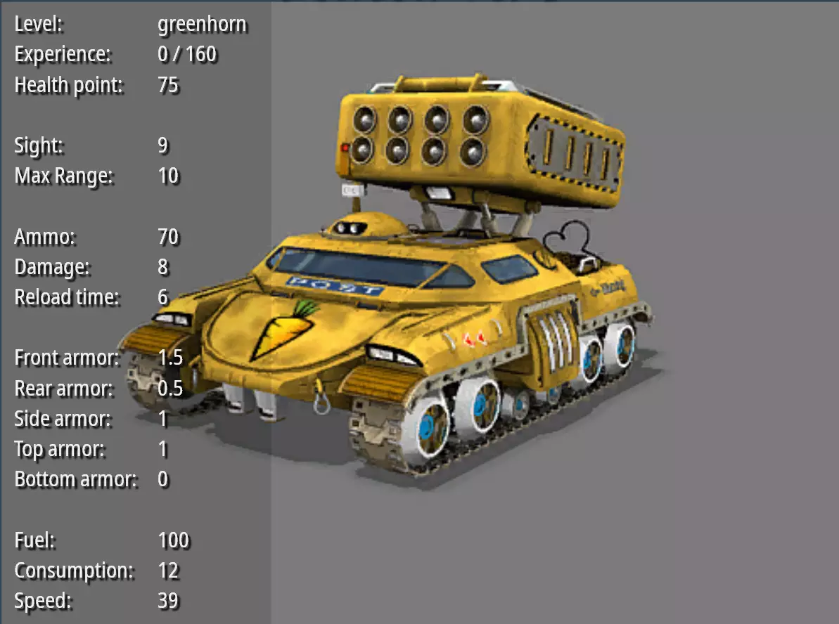 火箭发射器--平底控制台 耐久度:75 视野:9 最大射程:10 弹药量:70 破坏力:8 射击频率:6 前部装甲:1.5 后部装甲:0.5 两侧装甲:1 顶部装甲:1 底部装甲:0 燃料量:100 燃料消耗值:12 速度:39 造价:650 特殊能力:火箭齐射。