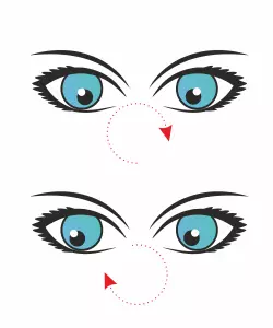 在进行这项视觉练习时,需要用眼球按以下方向各做7次运动:上下、左右、直上直下、直左直右。然后将视线投向房间的左上角,再平稳地将目光移至右下角,之后反向进行。每个动作重复7次。你可以不用做得太快。为获得更佳效果,请发挥想象力——以半圆视角进行描述,运用各种几何图形,或只是随意转动眼球,力求看到清晰的图像。 5.【大圆圈】