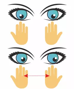 该名称来源于英文单词“palm”,意为“手掌”。 进行这项视觉练习时,需要放松并坐直。用手捂住眼睛,使右手掌中心与右眼瞳孔处于同一水平高度。左眼也需保持同样的姿势。不要将手掌用力按压在脸上。手指可以交叉放在额头上,也可以放在旁边,怎么舒服就怎么做。重要的是不能有透光的缝隙。请确保你遵守所有规则。现在垂下眼睑。眼睛不仅要闭上,还要用手掌额外保护,这样有助于它们完全放松。 3.【透过指缝】