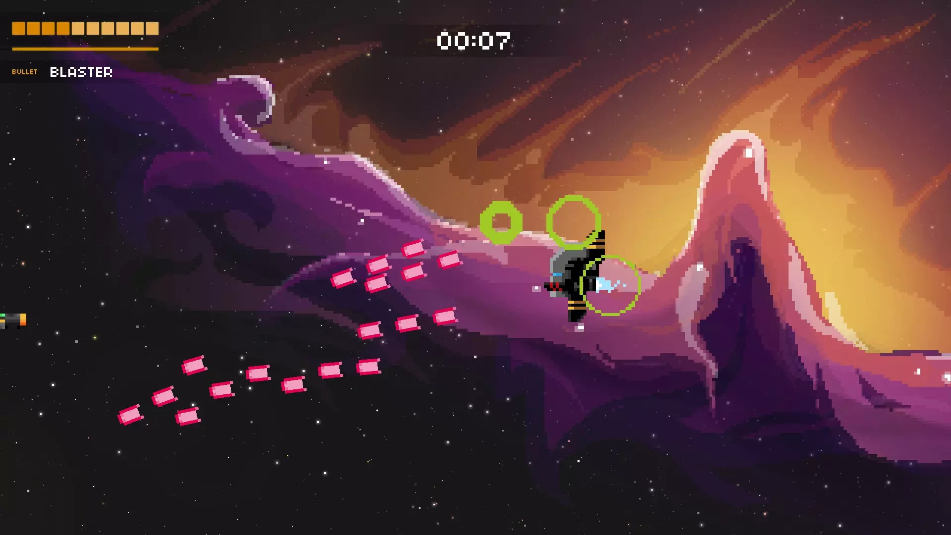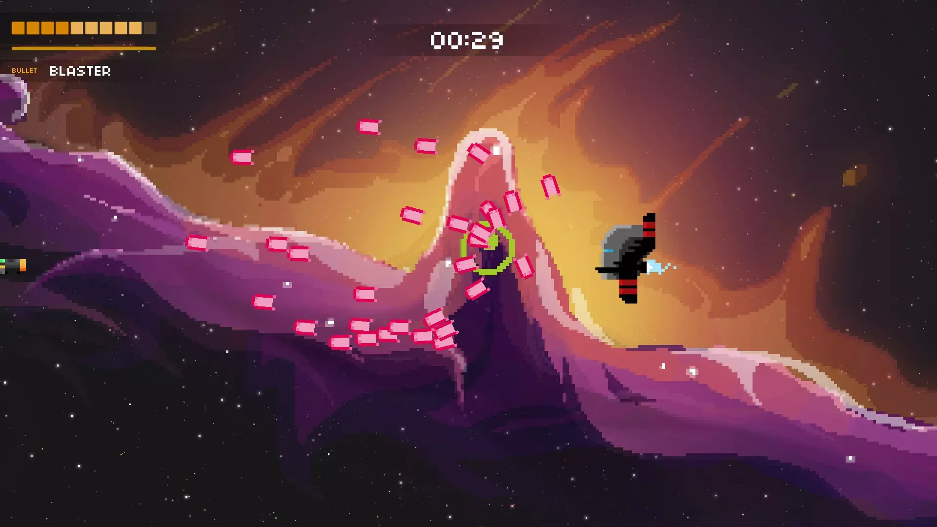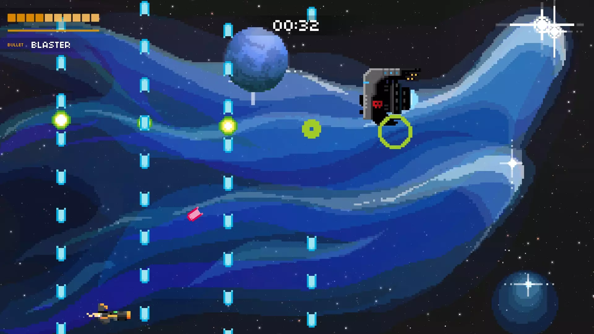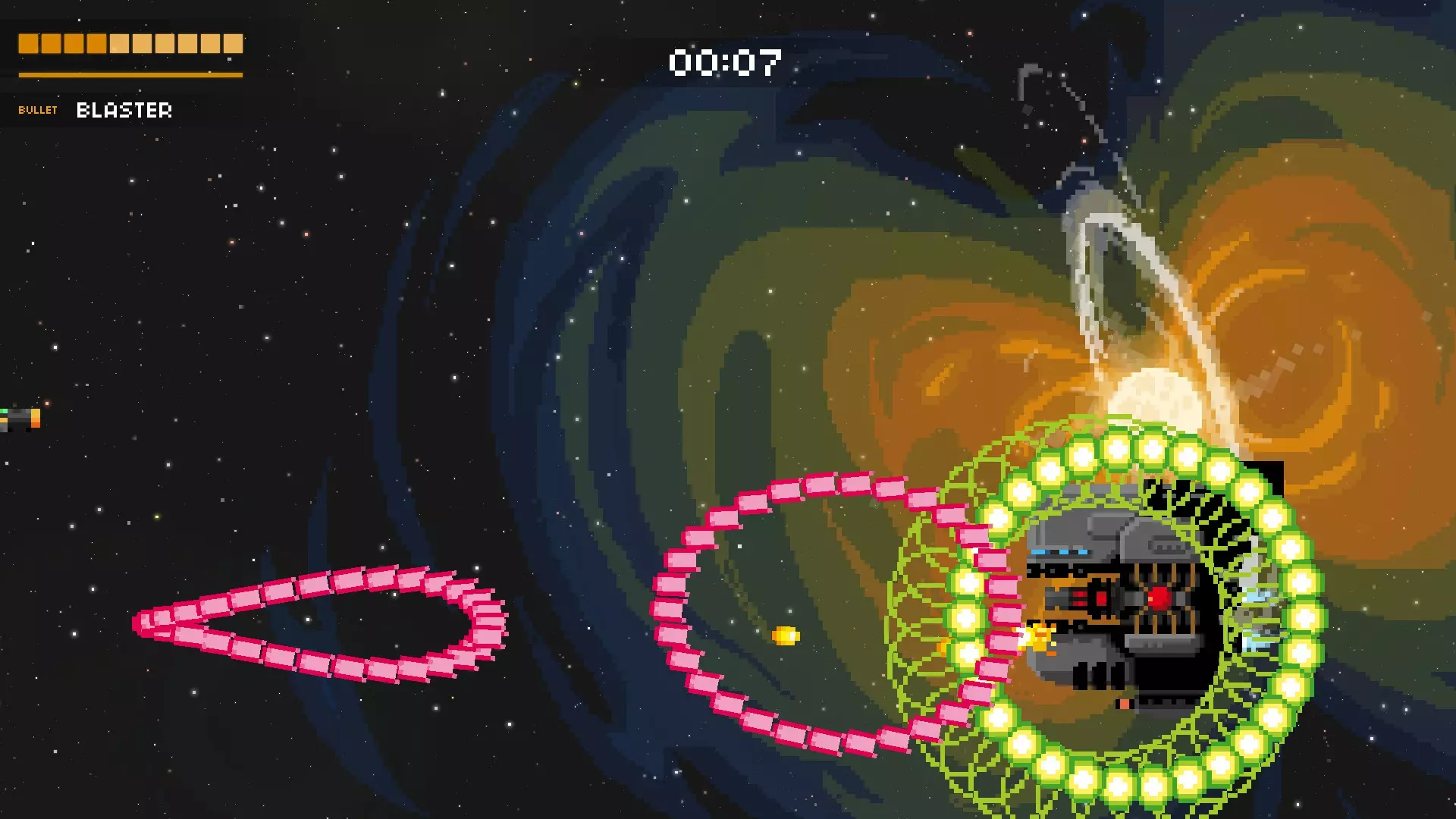 它会尝试用绿色的固定子弹将你困住。随后,它会开始用随机子弹和红色瞄准弹幕攻击你。再次保持在最左侧位置,这样能为你观察随机子弹争取到最多的反应时间。当红色弹幕发射时,冷静地上下移动躲避。如果你有枪兵机器人、追踪火箭或类似的武器,只需待在右下角持续射击即可。