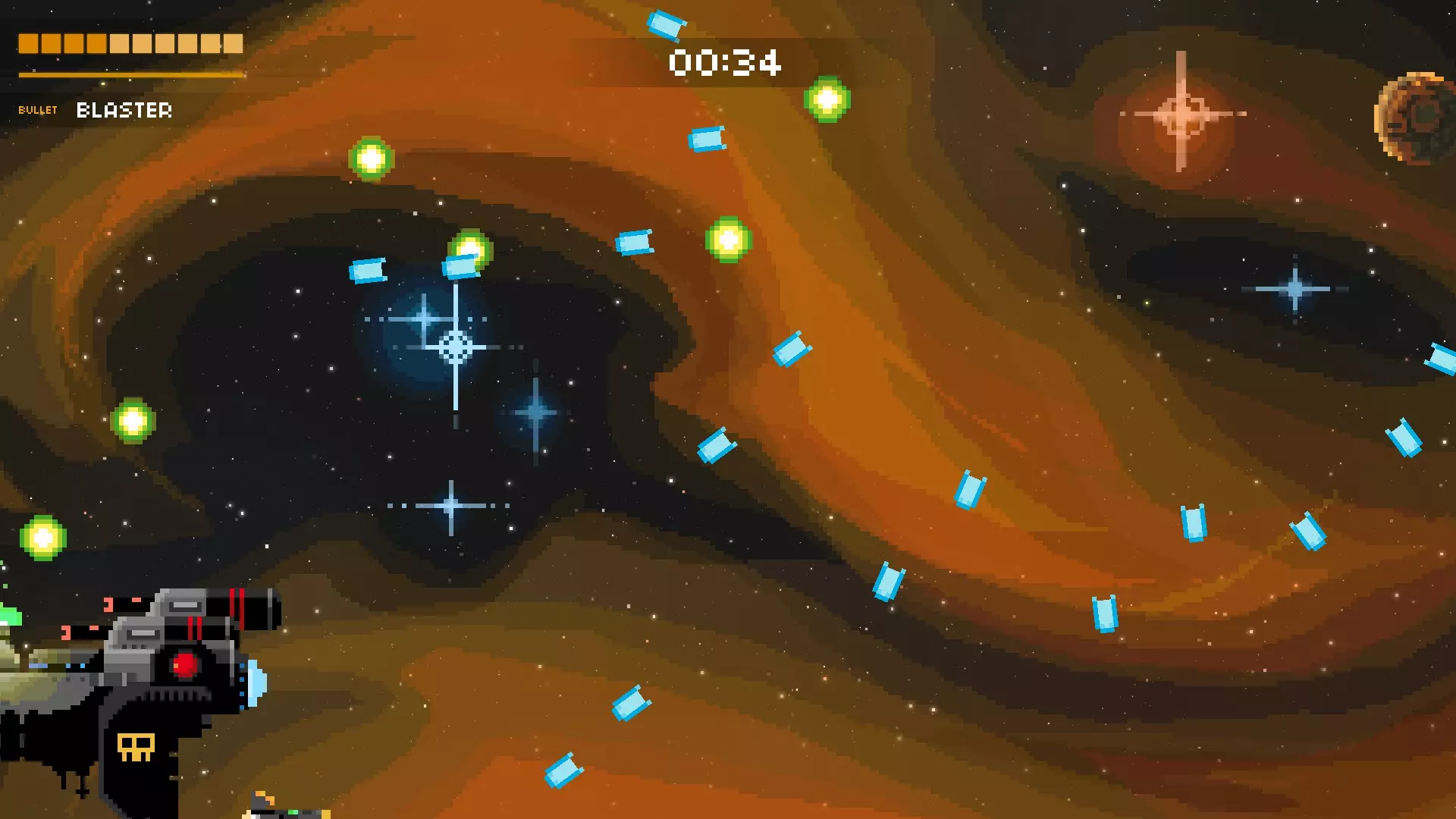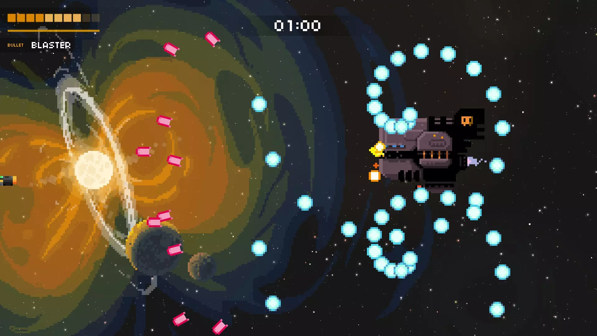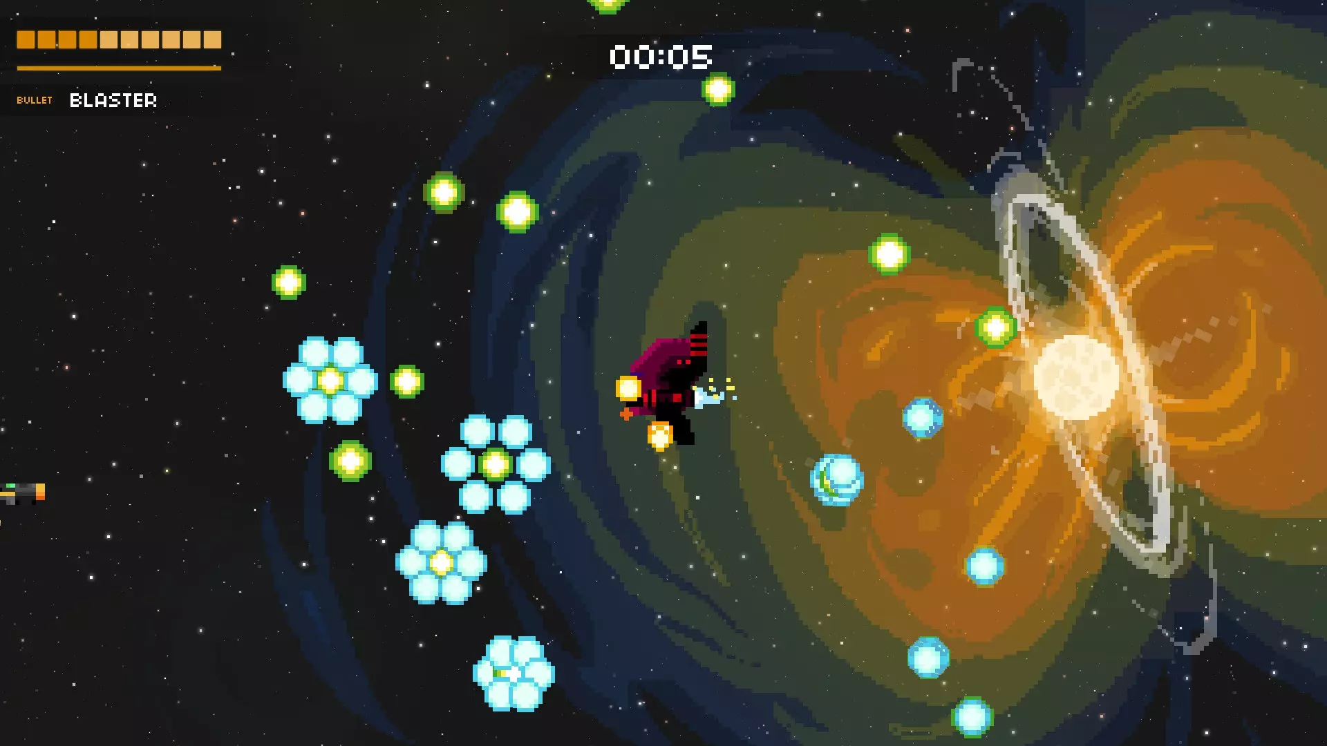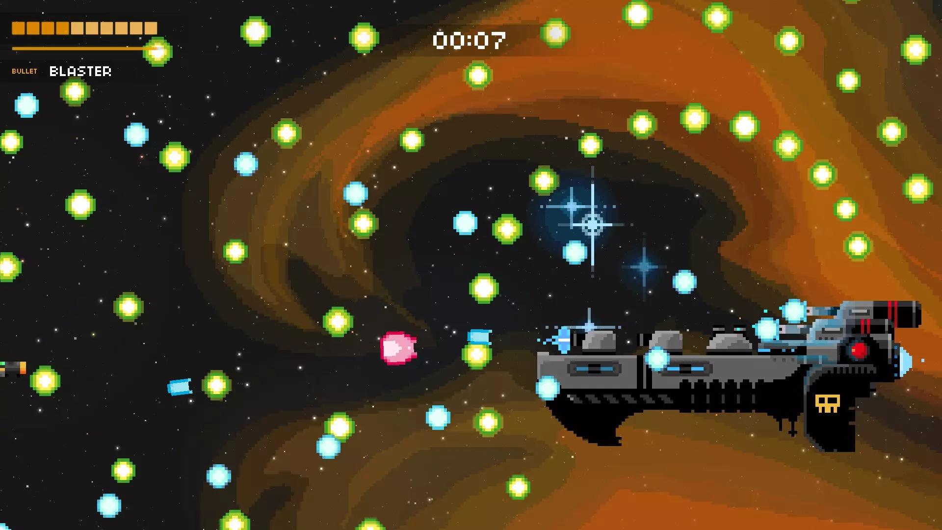 它会尝试用绿色的固定子弹将你困住。随后,它会开始用随机子弹和红色瞄准弹幕攻击你。再次保持在最左侧位置,这样能为你观察随机子弹争取到最多的反应时间。当红色弹幕发射时,冷静地上下移动躲避。如果你有枪兵机器人、追踪火箭或类似的武器,只需待在右下角持续射击即可。