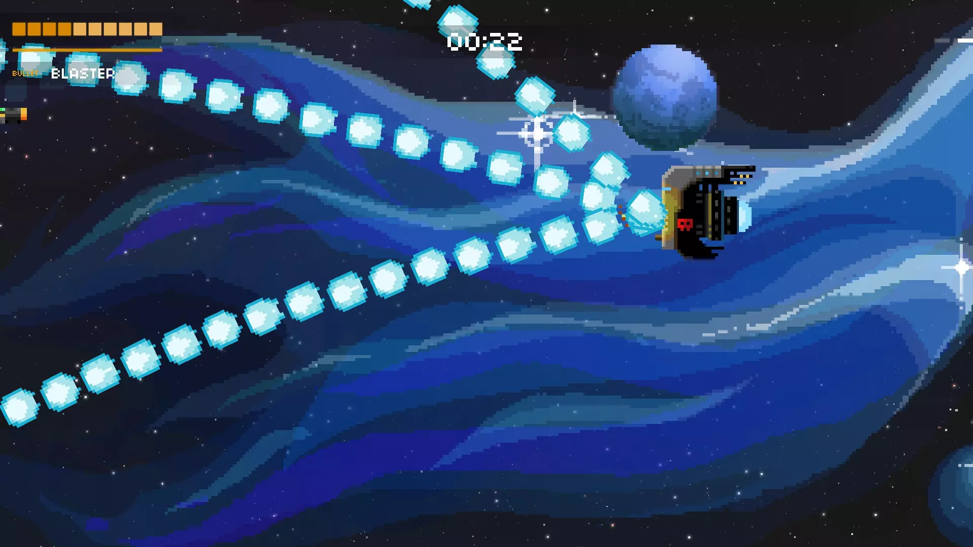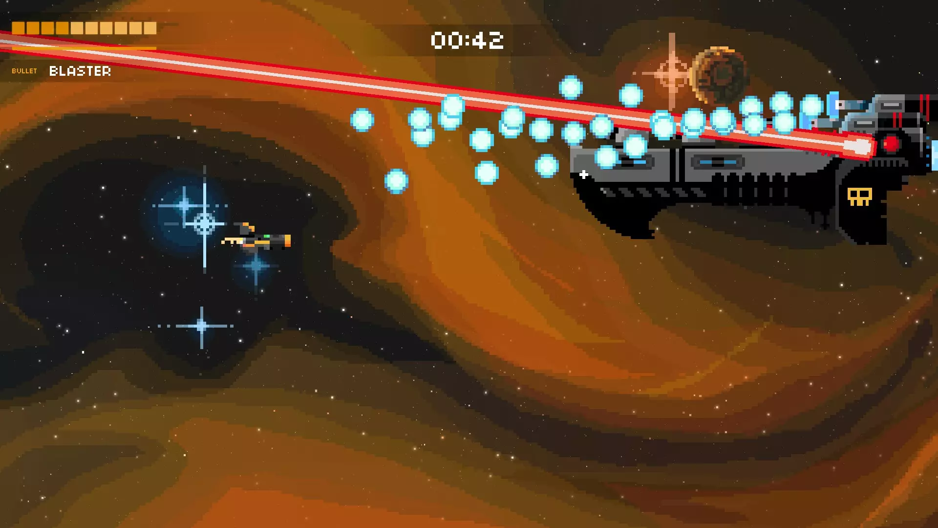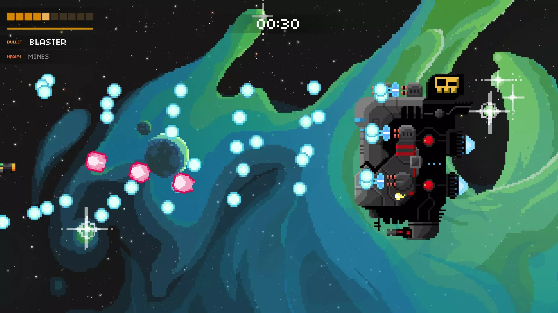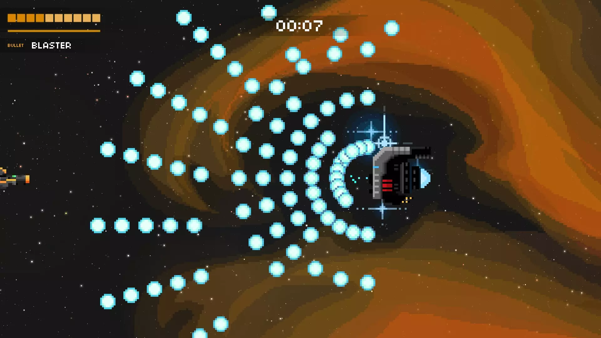 这是游戏中最为密集的攻击之一,甚至可能就是最密集的那种。护盾消失后,母舰会开始召唤更多小型战斗机和激光舰。并且它还会时不时发射绿色子弹,这些绿色子弹会迅速召唤出向上或向下飞行的蓝色子弹。务必保持警惕,这种攻击随机性很强,但只要你对所有来袭的攻击做出反应,它就不会把你完全困住,也并非无法躲避。尽量待在后方,最好使用像超级炮或超光速炮这类武器来消灭战斗机,并且一定要注意躲避绿色子弹。如果你被绿色子弹“困住”,同时还有战斗机发射的瞄准子弹向你袭来,那就垂直移动。这种攻击极其混乱,没有真正的主要策略,它会最大限度地考验你的升级构筑和自身的弹幕躲避技巧。 战列舰 这艘船可能吓跑了很多想在游戏中进一步深入的玩家。它的攻击速度快、弹幕密集且威力极大(大多数子弹似乎能造成2或3点伤害)。 如果你不知道应对它的策略,这个 boss 可能会很吓人,这也是我选择展示视频而非图片的原因。当 boss 战开始时(或在“过场动画”中),按住向左键!前四发子弹应该会打空。当后续子弹出现时,开始移动。只需缓慢向上移动,当你停止攻击到 boss 时,开始向下移动。你也可以在每两次红色射击时按上-下-上-下,但一定要把握好时机,因为蓝色射击会增加难度。这里有一个我的视频,展示了两种技巧:连续射击和Z字形射击。