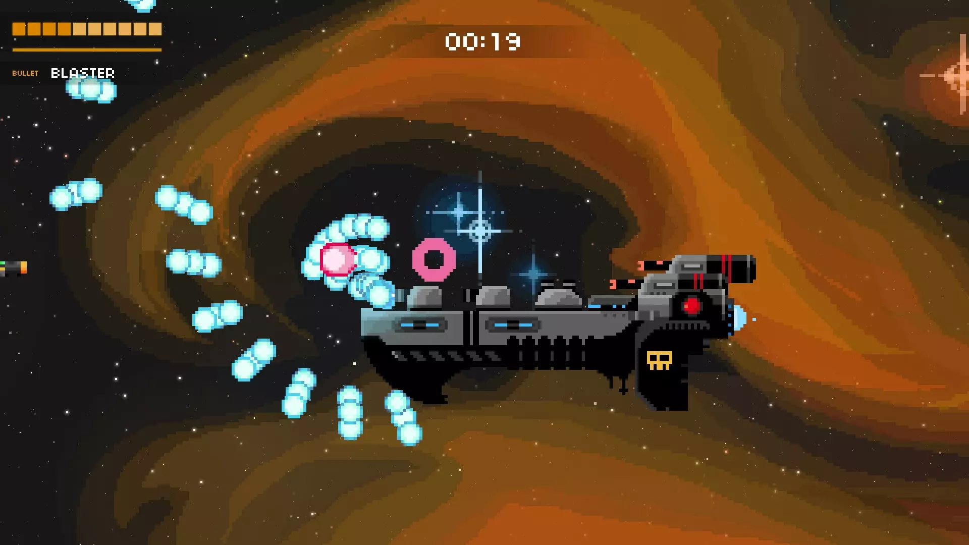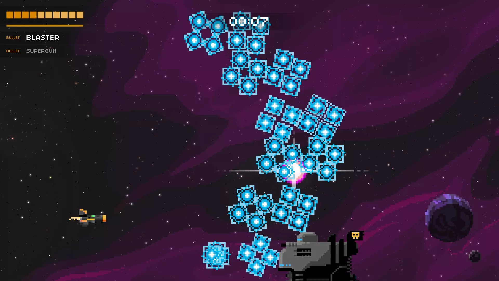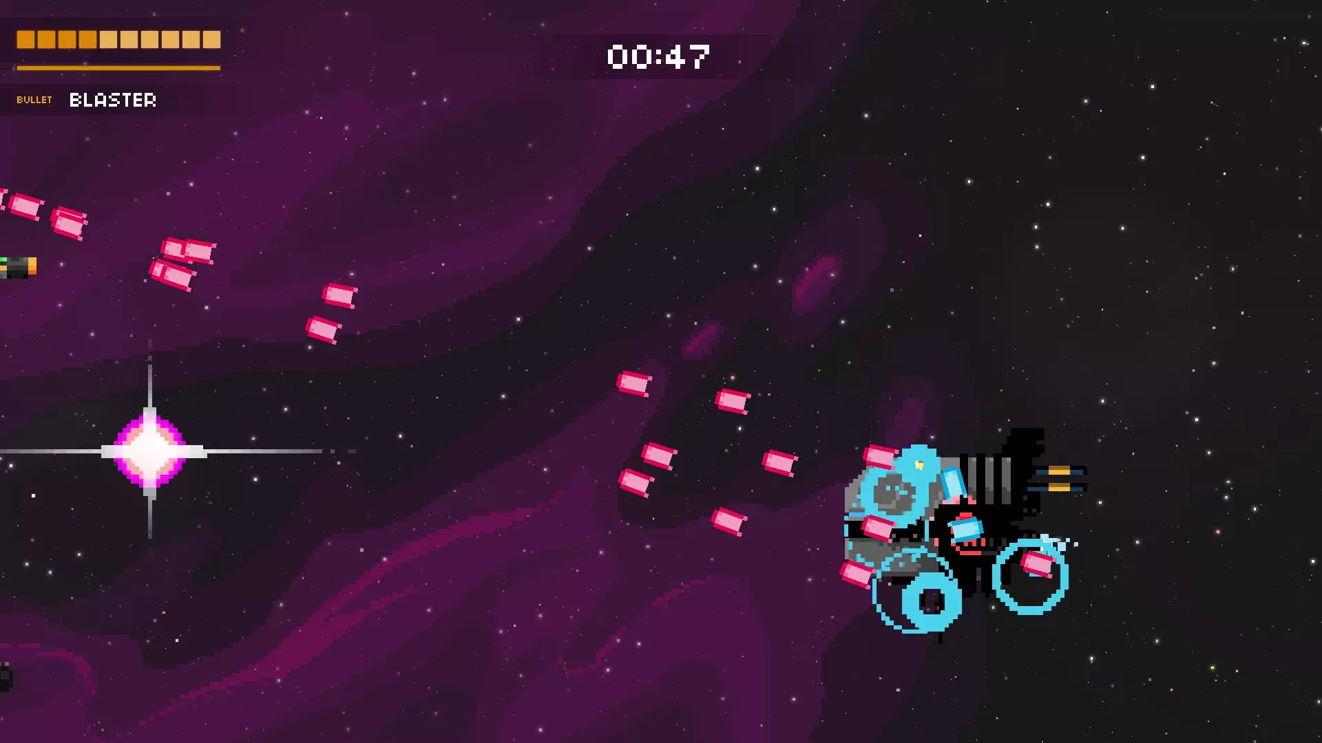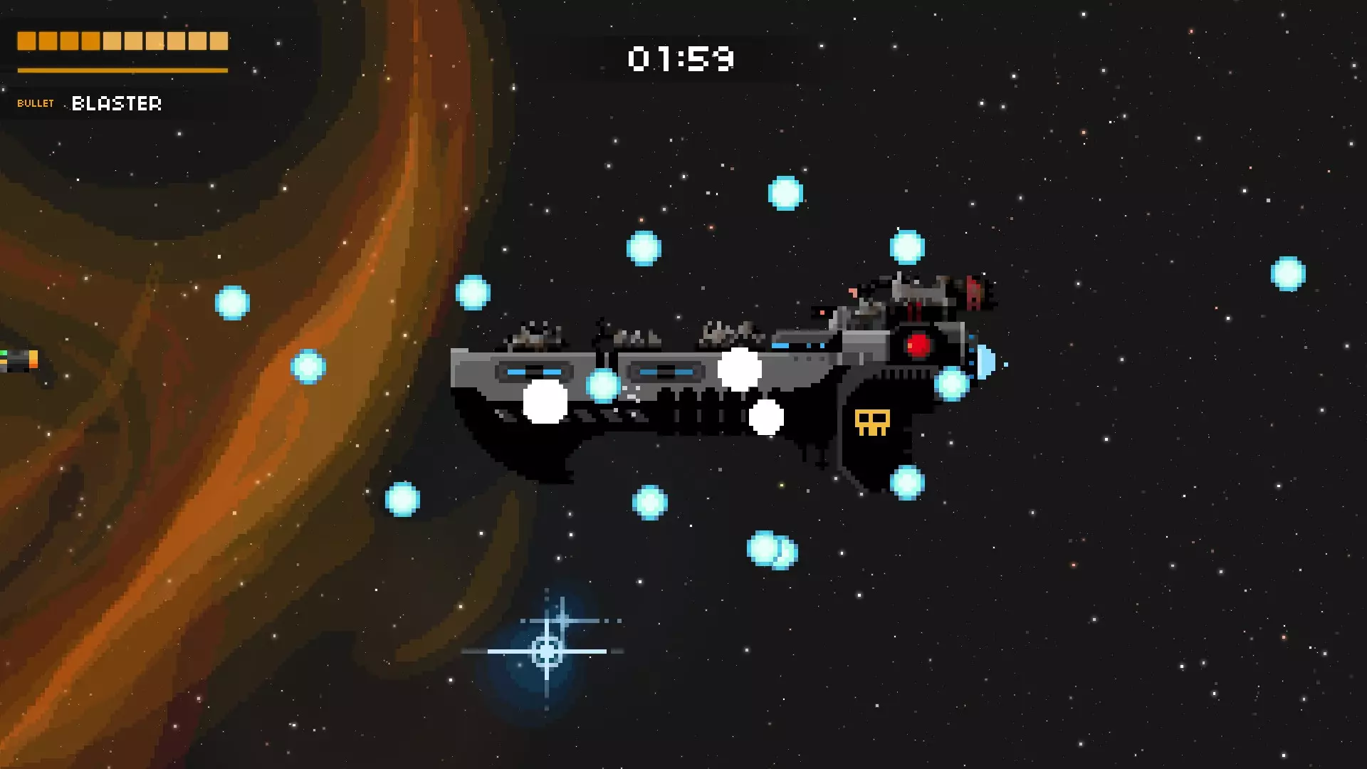 这是游戏中最为密集的攻击之一,甚至可能就是最密集的那种。护盾消失后,母舰会开始召唤更多小型战斗机和激光舰。并且它还会时不时发射绿色子弹,这些绿色子弹会迅速召唤出向上或向下飞行的蓝色子弹。务必保持警惕,这种攻击随机性很强,但只要你对所有来袭的攻击做出反应,它就不会把你完全困住,也并非无法躲避。尽量待在后方,最好使用像超级炮或超光速炮这类武器来消灭战斗机,并且一定要注意躲避绿色子弹。如果你被绿色子弹“困住”,同时还有战斗机发射的瞄准子弹向你袭来,那就垂直移动。这种攻击极其混乱,没有真正的主要策略,它会最大限度地考验你的升级构筑和自身的弹幕躲避技巧。 战列舰 这艘船可能吓跑了很多想在游戏中进一步深入的玩家。它的攻击速度快、弹幕密集且威力极大(大多数子弹似乎能造成2或3点伤害)。 如果你不知道应对它的策略,这个 boss 可能会很吓人,这也是我选择展示视频而非图片的原因。当 boss 战开始时(或在“过场动画”中),按住向左键!前四发子弹应该会打空。当后续子弹出现时,开始移动。只需缓慢向上移动,当你停止攻击到 boss 时,开始向下移动。你也可以在每两次红色射击时按上-下-上-下,但一定要把握好时机,因为蓝色射击会增加难度。这里有一个我的视频,展示了两种技巧:连续射击和Z字形射击。