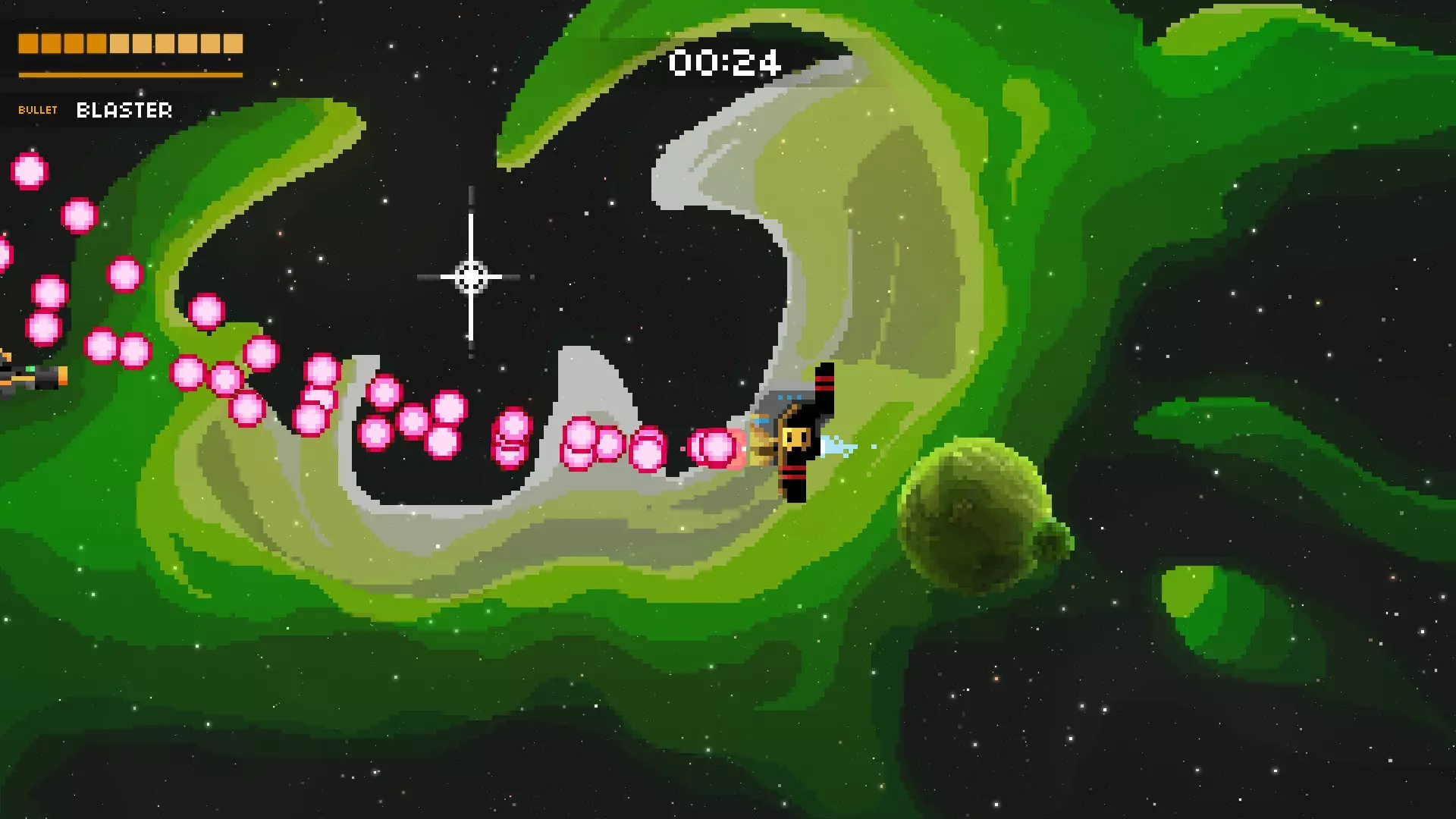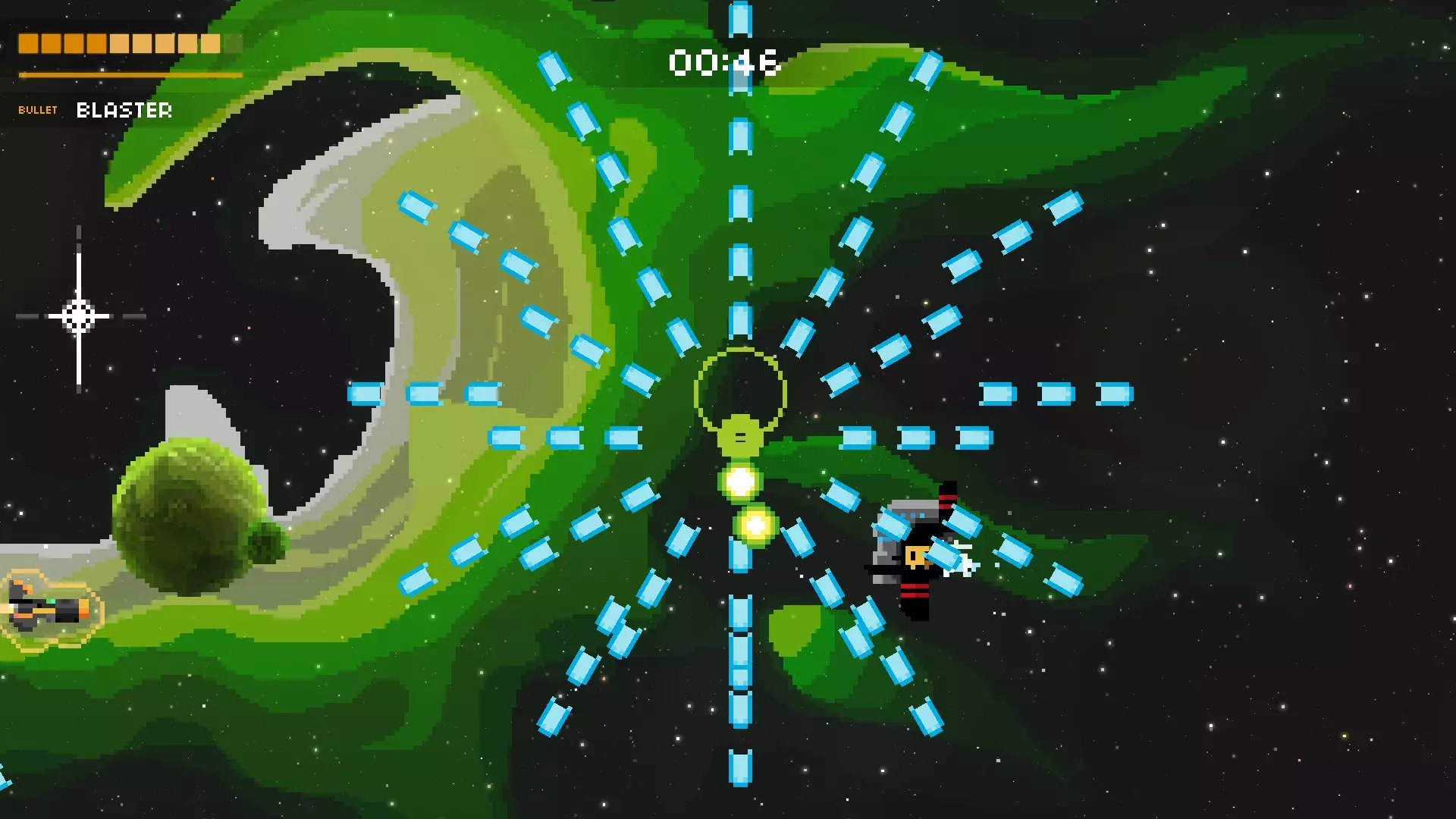 他会向上发射绿色球体,这些球体会射出12发蓝色子弹。不要尝试躲避中间的绿色子弹,直接到他下方即可。没错,你可以这么做,去到最底部,他就不会冲撞你。