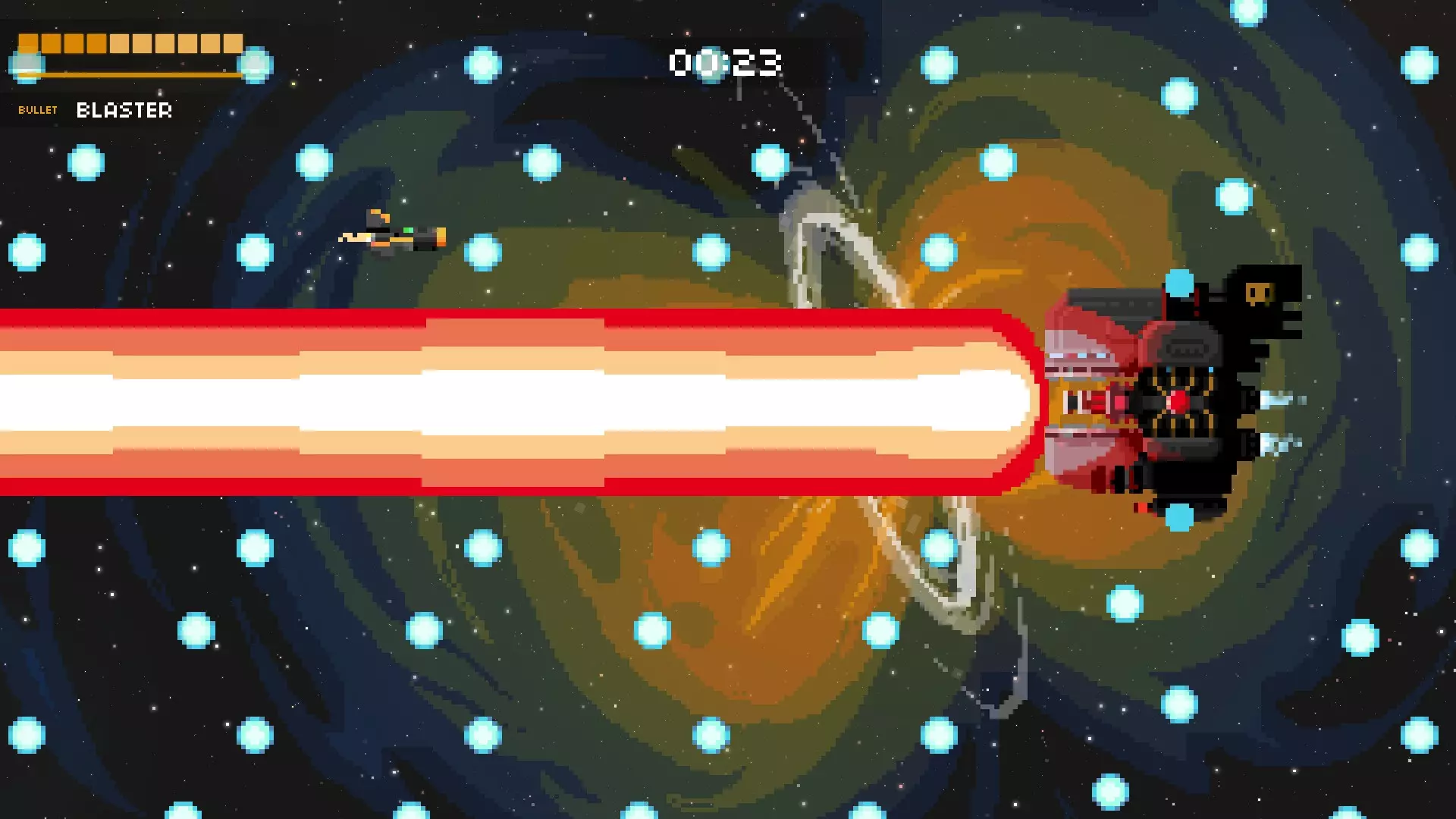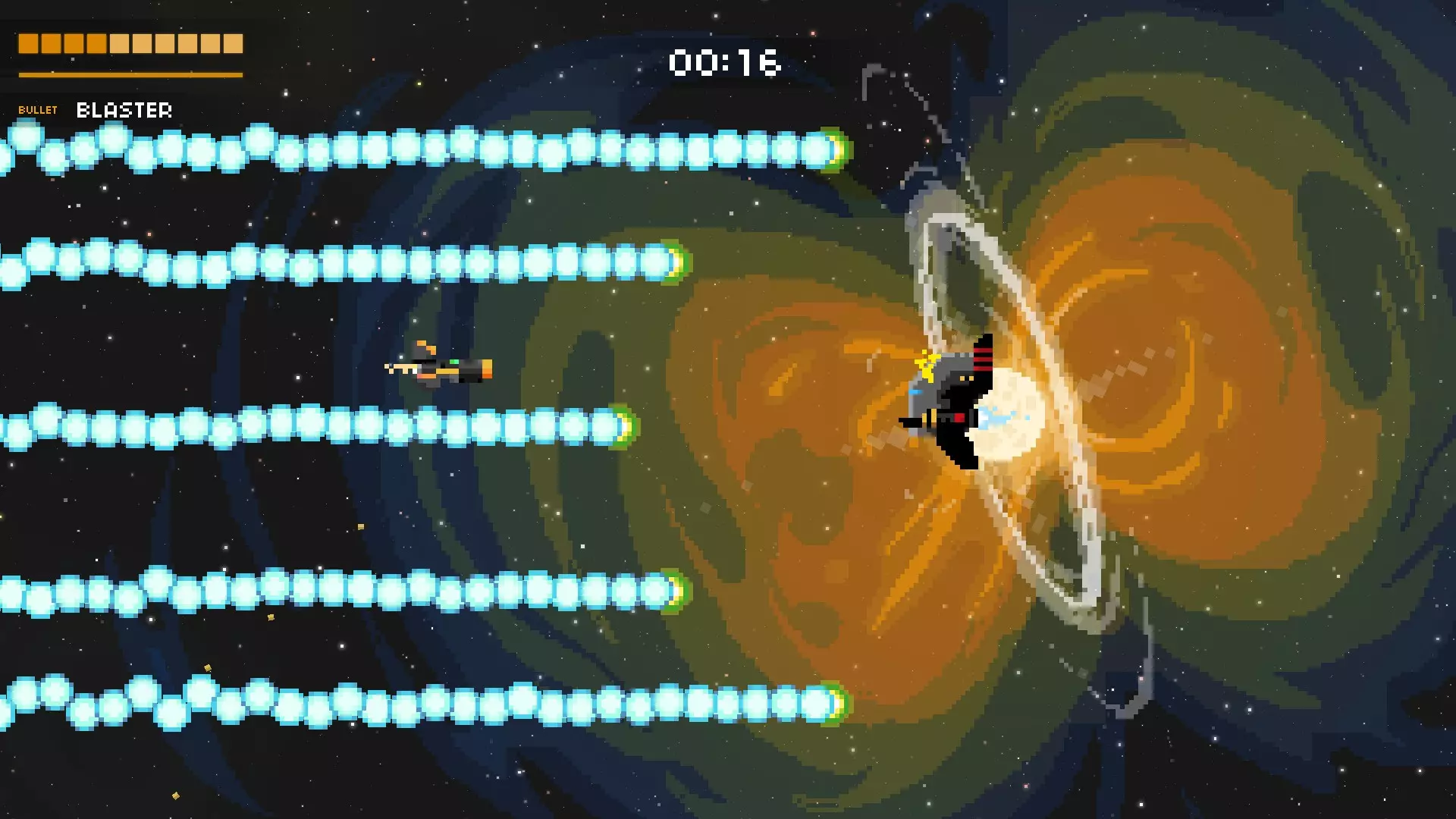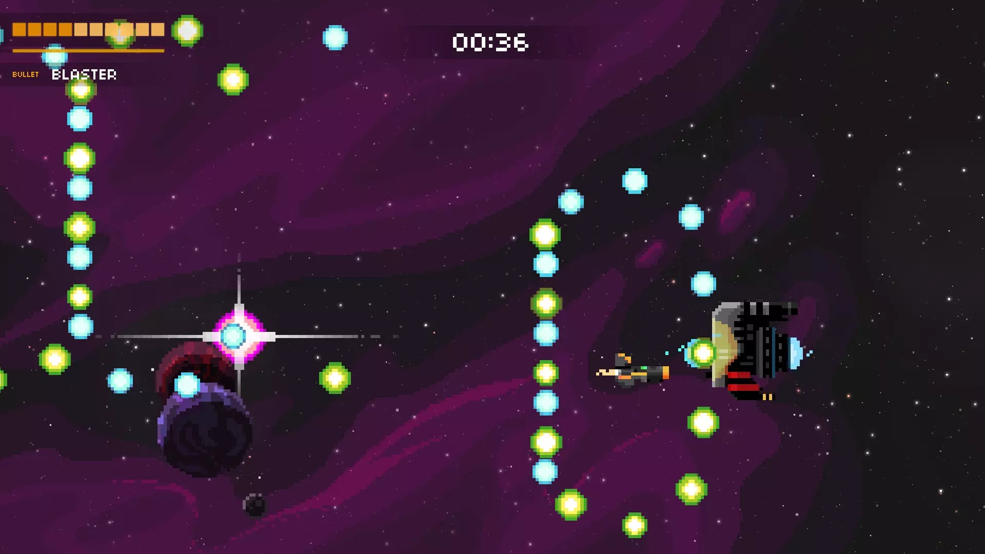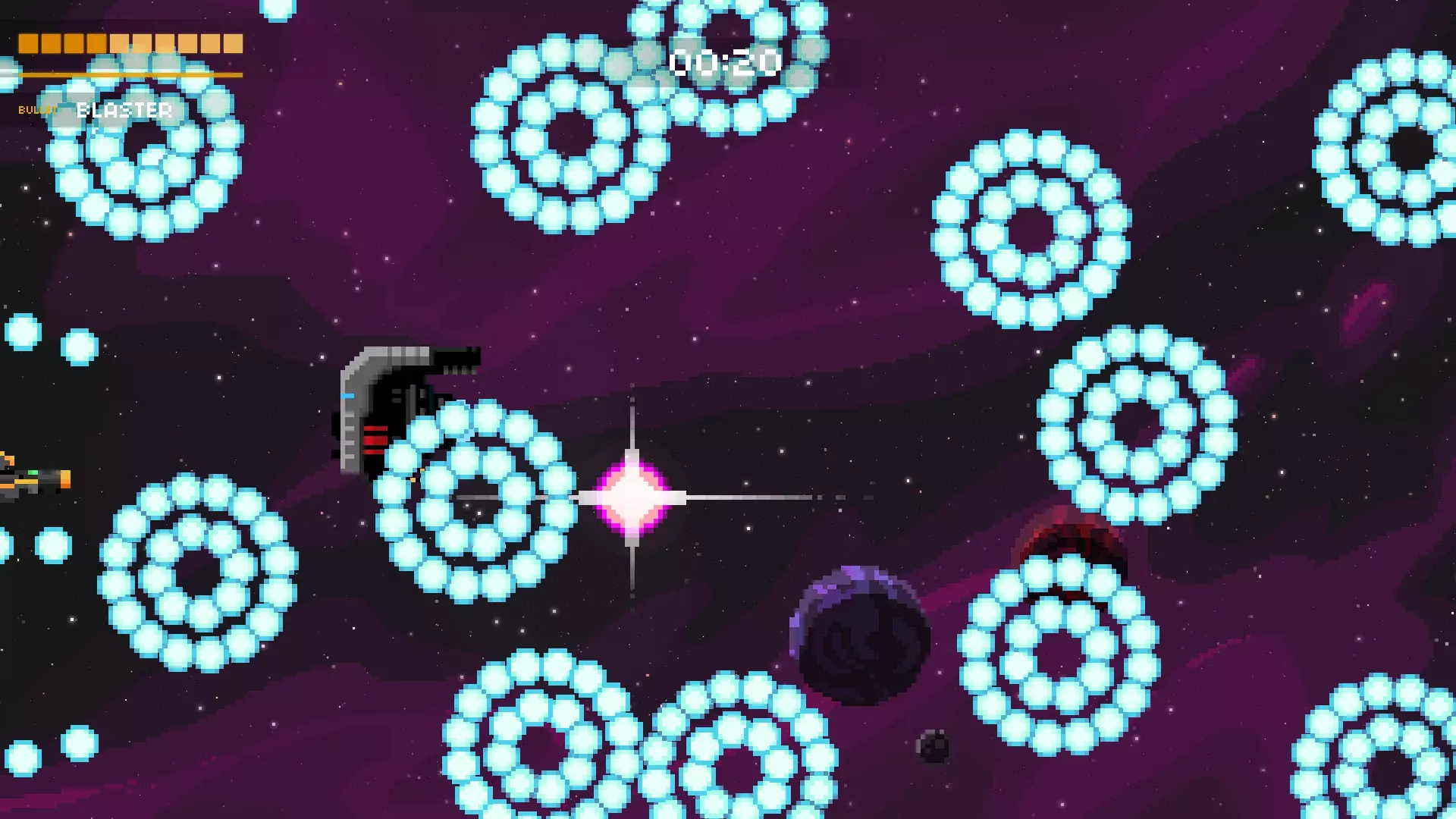 它会将你困在两道激光之间,其中一道激光会停止,随后它会开始发射一连串子弹。若有一道激光消失,就赶紧离开。离它越远,你的反应时间就越多,但如果想击中更多子弹,可以稍微靠近它一些。