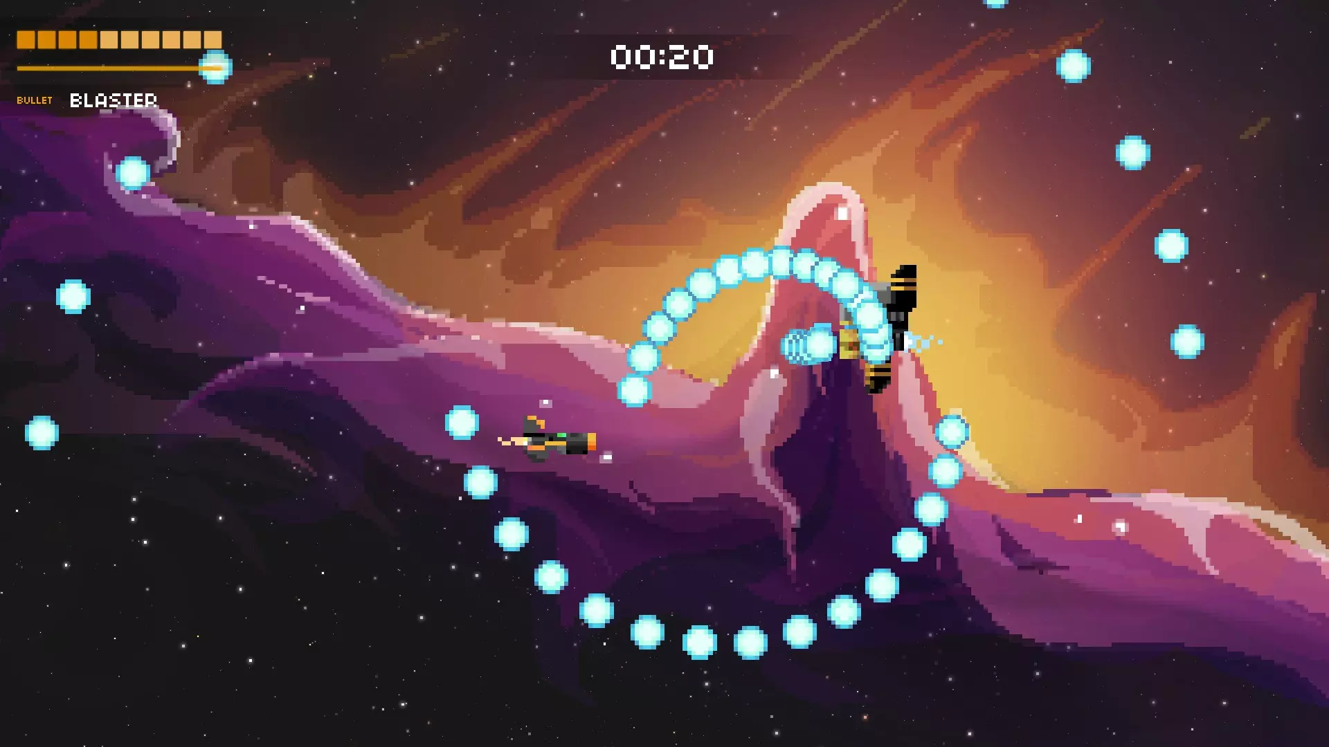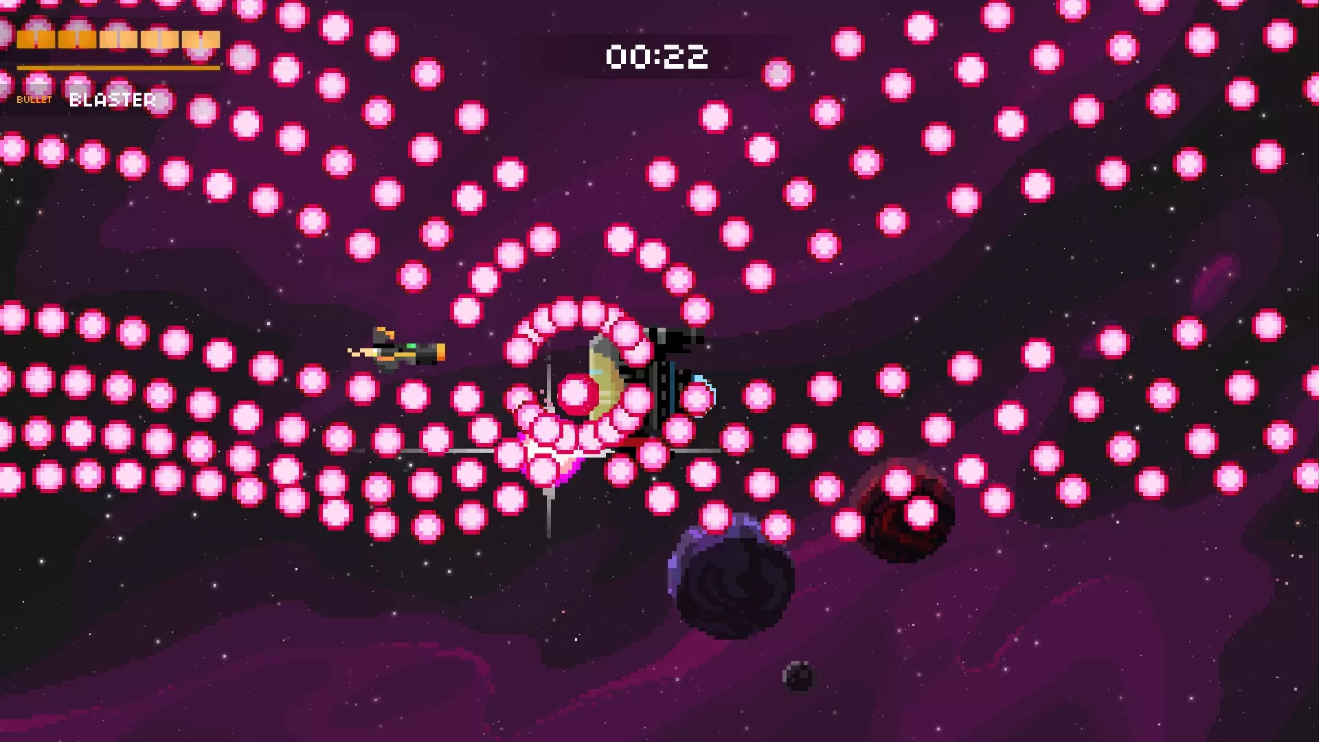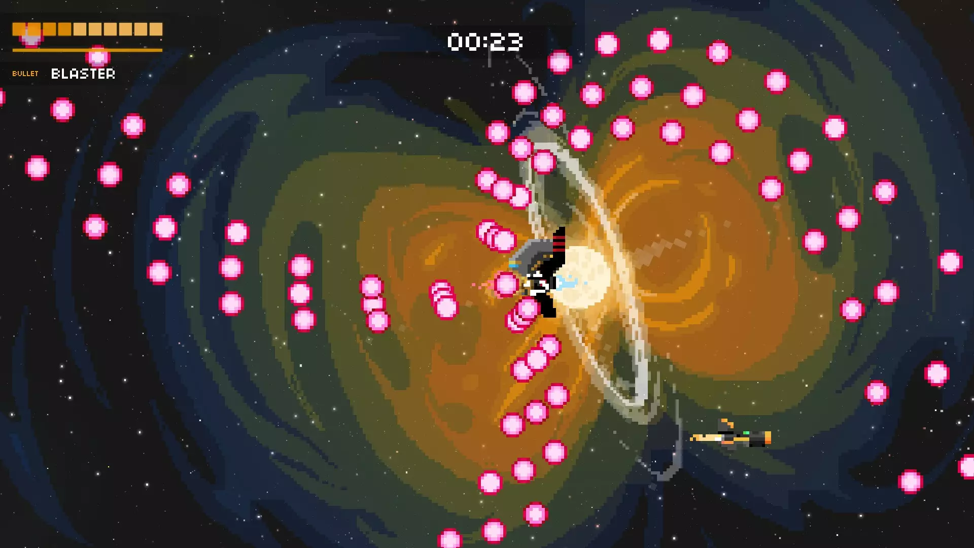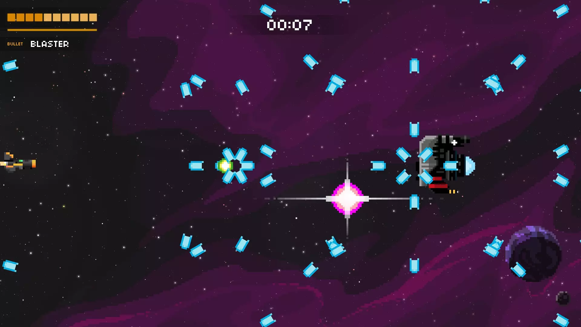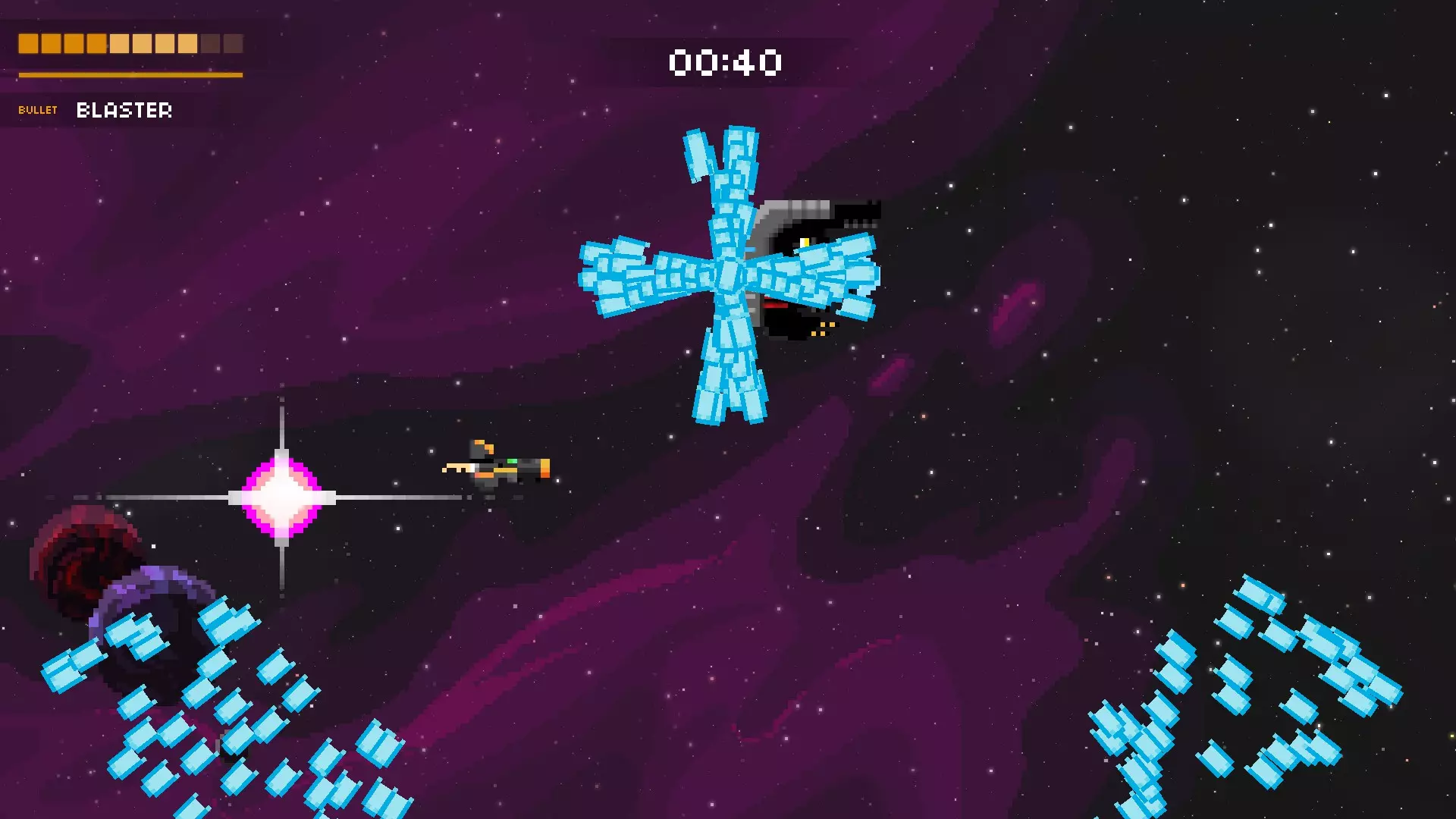 它会将你困在两道激光之间,其中一道激光会停止,随后它会开始发射一连串子弹。若有一道激光消失,就赶紧离开。离它越远,你的反应时间就越多,但如果想击中更多子弹,可以稍微靠近它一些。