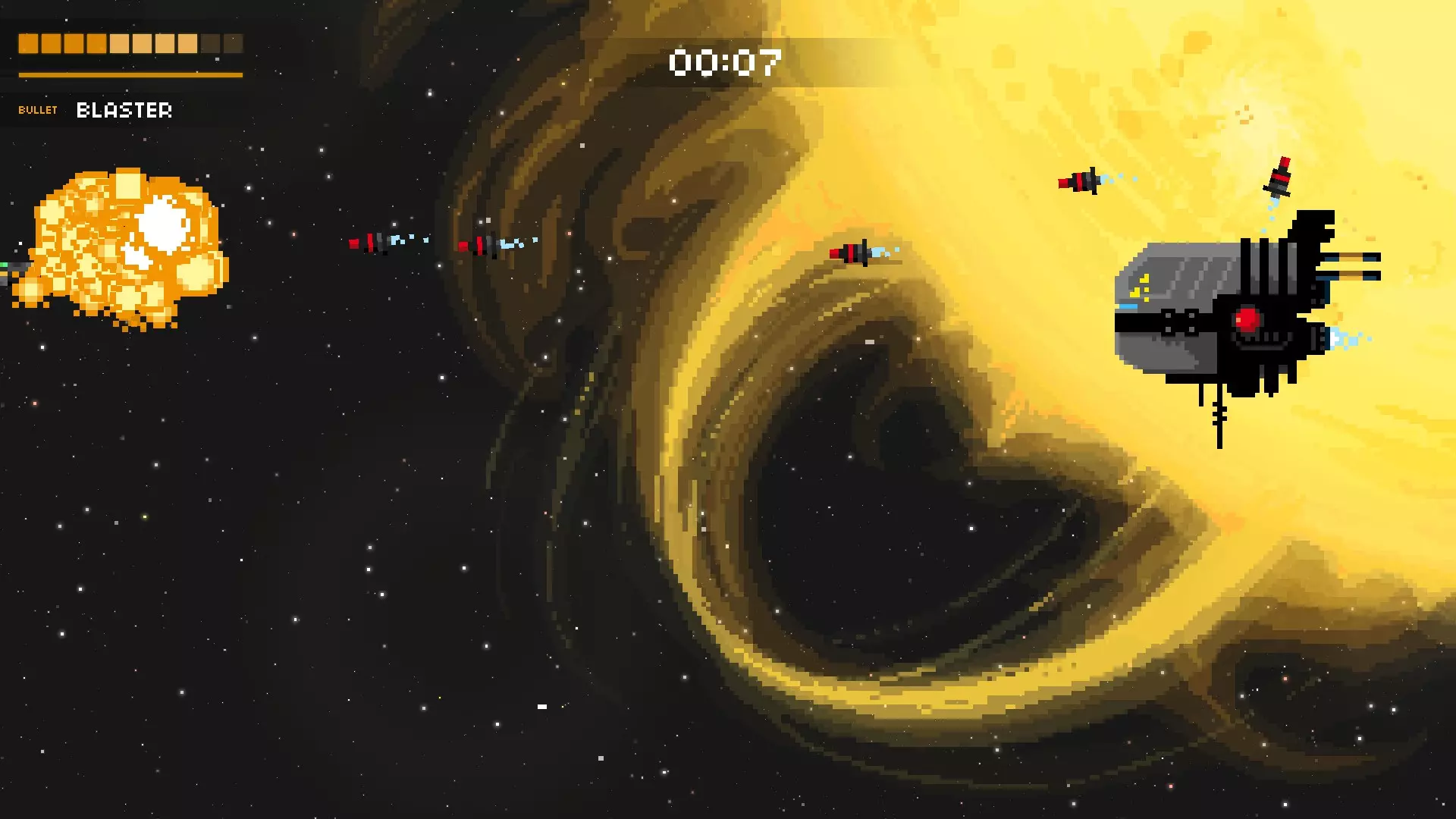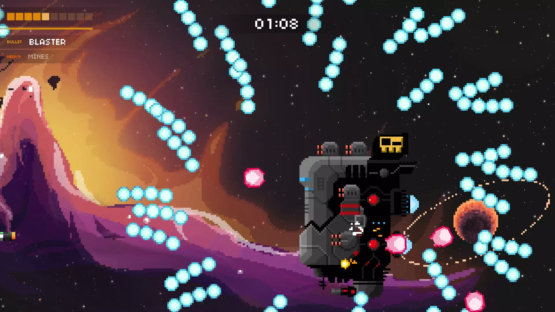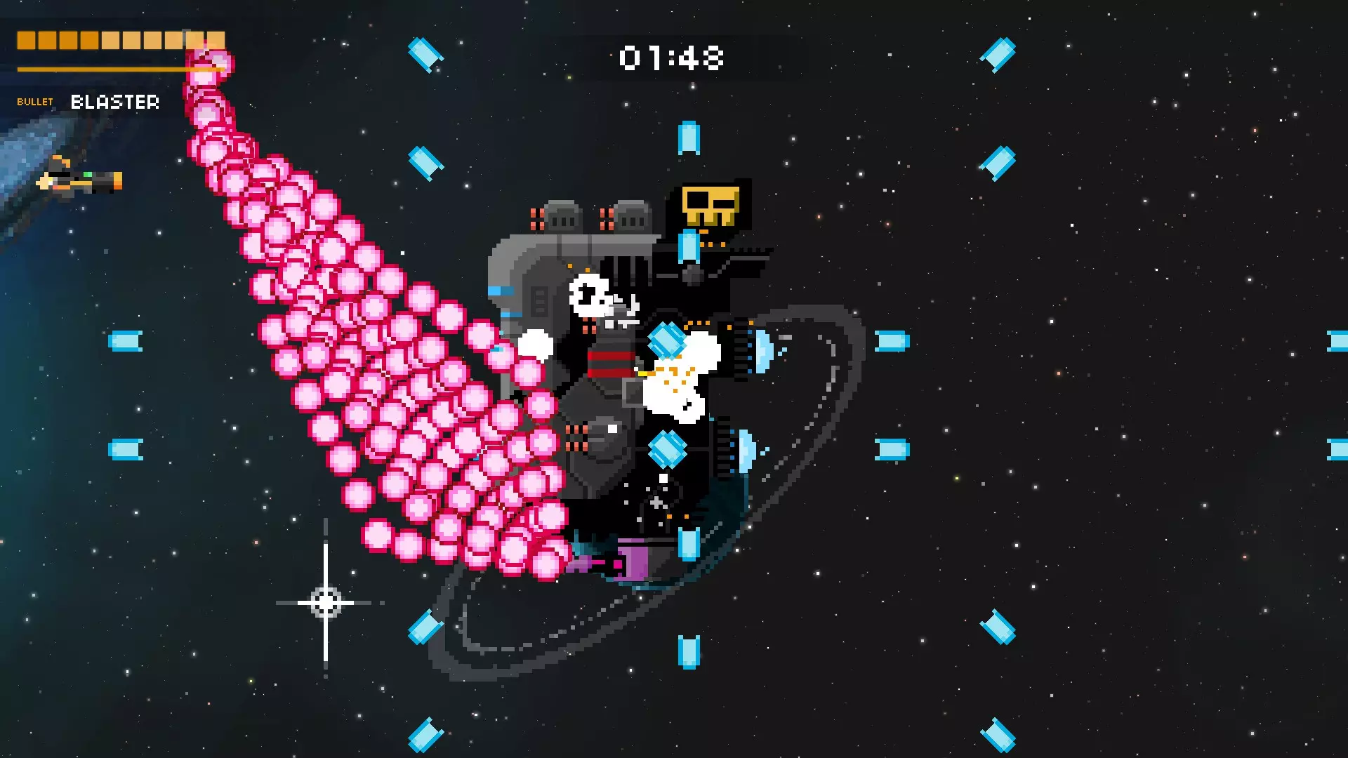 恐慌攻击:子弹会以随机角度射出,是非常可怕的攻击。待在左侧,留意任何可能靠近你的子弹,只能祈祷运气站在你这边。如果它离你非常近,你可以移动到右侧、底部或顶部,但这意味着你要躲避更多子弹,所以我认为这不值得。 母舰:这家伙才是真正的恐怖存在,能区分出好的游戏进程和坏的游戏进程。建议你至少拥有1件非集火类武器。像超级炮、冲击波和机器人这类武器,能帮你减轻它召唤出的敌人带来的麻烦。另外,在它的第二次攻击中,使用带有溅射或穿透效果的武器对付它召唤的激光舰会很有效。
