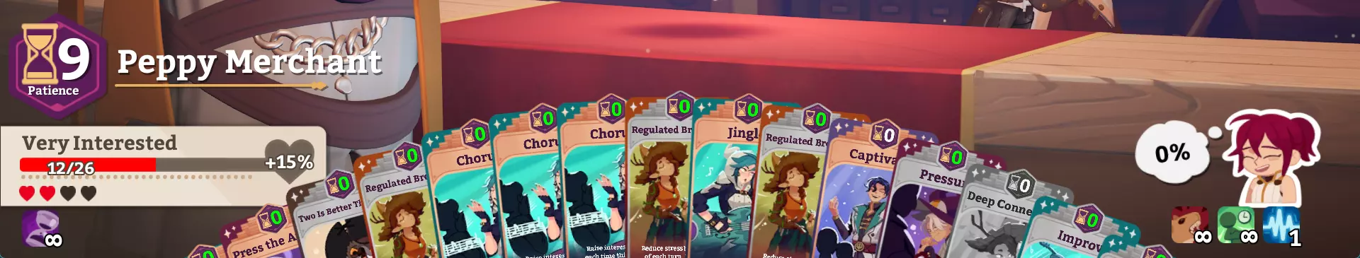 如何游玩 这套卡组很棒,但我们该如何使用它,其中部分卡牌的作用又是什么呢? 主题 这是一套【合唱-速攻】卡组。其核心目标就是每回合尽可能打出更多卡牌,并最大化【合唱】的效果。 【合唱】的效果极为强大。每次使用该卡牌,它的效果就会提升5点。 首次使用 - 5点利息 第二次使用 - 10点利息 第三次使用 - 15点利息 …… 第六次使用 - 30点利息 在中期游戏中,只需消耗1点耐心,没有任何卡牌能与它媲美。这套卡组的构建就是围绕着最大化【合唱】的加成效果,让你能够按照自己的节奏结束交易。 操作顺序 接下来我们来谈谈哪些卡牌的使用优先级更高。最重要的卡牌 - 按顺序排列 节奏 双管齐下 即兴发挥 其他重要卡牌 计划 猛烈进攻 冥想 松鼠的凶猛 为什么是这些卡牌?上述卡牌是卡组能够运作的核心。即兴发挥、计划和猛烈进攻都是你的抽卡手段。抽的牌越多,能打出的牌就越多。优先使用即兴发挥,其次是计划,如果没有其他抽卡选择再用猛烈进攻。猛烈进攻的存在纯粹是为了给你更多机会抽到即兴发挥和计划。 冥想对于保持低压力值至关重要。由于你抽了太多牌,即使是10%的压力也可能造成灾难,因为有用的卡牌会变成压力牌,进而引发严重的压力螺旋。如果可以的话,永远不要在压力值超过12%时开始交易。15%可以很快提升到40%,而抽到压力牌会彻底毁掉这套牌组。 松鼠的凶猛是为了弥补糟糕的随机数生成。当松鼠的凶猛效果激活时,你打出的每张牌都会造成2点利息,这意味着即使遇到一些坏的随机情况,你也总能造成利息并朝着最终目标前进。这也意味着使用冥想减少压力的同时也会施加利息,所以你可以在最大化某人利息的同时减少自己的压力。 压力牌在牌组中是为了在你复制一到两次合唱之后使用。它能让你获得额外的抽牌机会,并以可能丢弃其他有用卡牌为代价尽快结束回合。仅在万不得已时才使用【压力】来抽牌,因为你所有其他的抽牌选项都更优。 【节奏】是这套卡组真正强大的核心。一旦打出这张牌,你的下一回合实际上就会变得无限,乐趣就此开始。如果你抽到【节奏】,确保在打出它并结束回合时,下一回合开始时你至少拥有3点【耐心】。