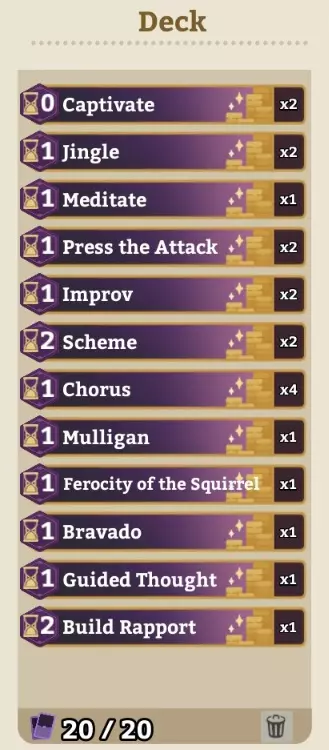 一个游戏中期(约第20天)的套牌,能让你永不结束回合,并在最晚第2回合以最大利息达成交易。 核心需求 希德 - 等级6 奎因 - 等级5 萨弗伦 - 等级5 猫头鹰 - 等级2 巴蒂斯特 - 等级1 科萨克 - 等级1 套牌构成 你是否在寻找一套能在超过90%的情况下让忙碌顾客达到最大利息的套牌?这套牌就能做到,并确保你每次都能以最高价格出售药水! 如果你需要玩法指导,下文有更多信息。如果你想自己尝试而不看指导,以下是卡牌列表,无需额外搜索或查找信息。卡牌: - 和声 x4 - 即兴发挥 x2 - 叮当声 x2 - 冥想 x2 - 节奏 x2 - 计谋 x2 - 迷惑 x1 - 深度联结 x1 - 松鼠的凶猛 x1 - 持续进攻 x1 - 压力 x1 - 两个总比一个好 x1