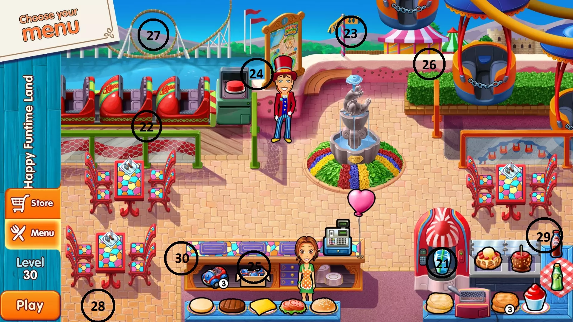 欢乐时光乐园 第三家餐厅:欢乐时光乐园 关卡 位置 21 冰沙机内部 22 故障过山车旁的栏杆 23 屏幕顶部中央的路标旁 24 表演者左侧 25 柜台中央垫子下方 26 hedge左侧上方(摩天轮座舱下方) 27 过山车的环形轨道内 28 屏幕左下角 29 屏幕右侧食物柜台上方(汽水所在处) 30 柜台左侧