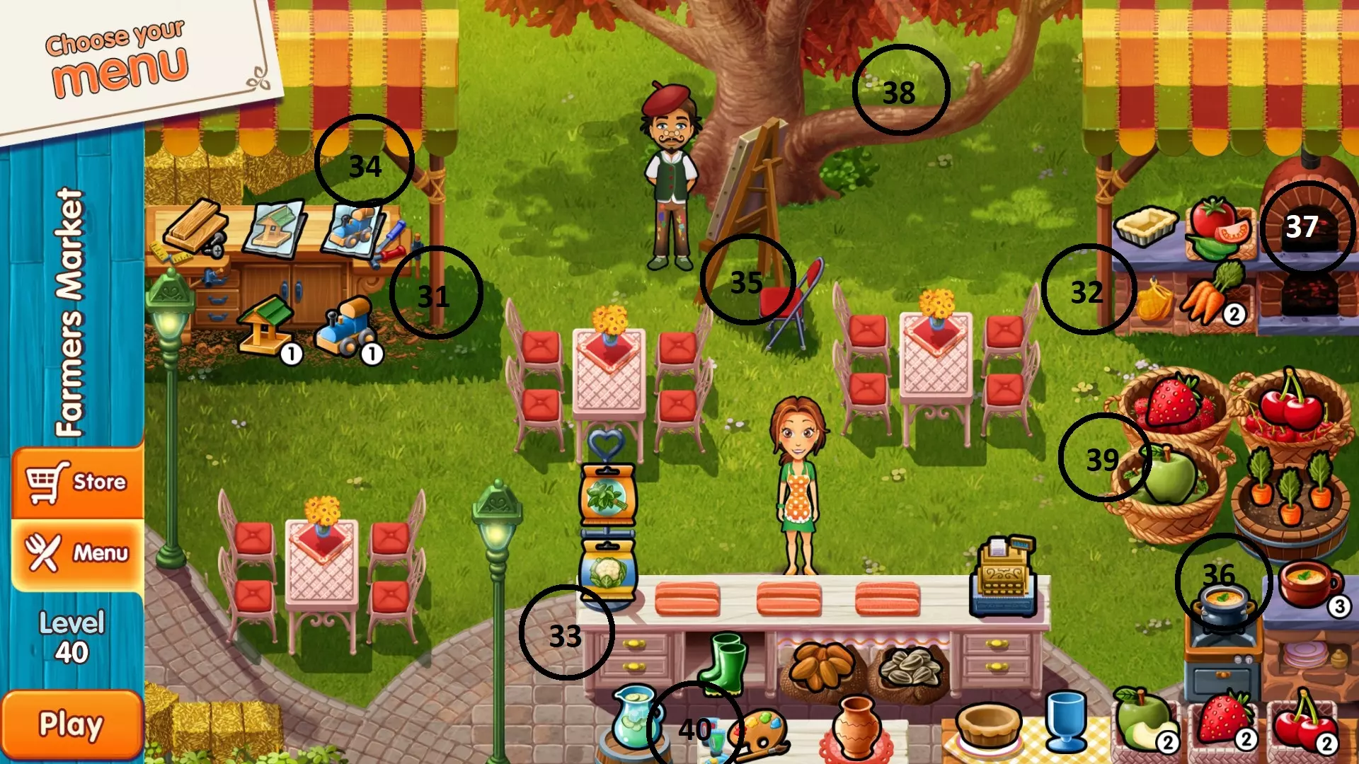 农贸市场 第四家餐厅:农贸市场 关卡 位置 31 木工桌支柱旁 32 烤箱支柱旁 33 柜台左侧 34 木工桌上方、屋顶下方 35 画架下方 36 汤锅中 37 烤箱内(上层) 38 树右侧的树枝上 39 水果篮侧面 40 水和调色板之间
