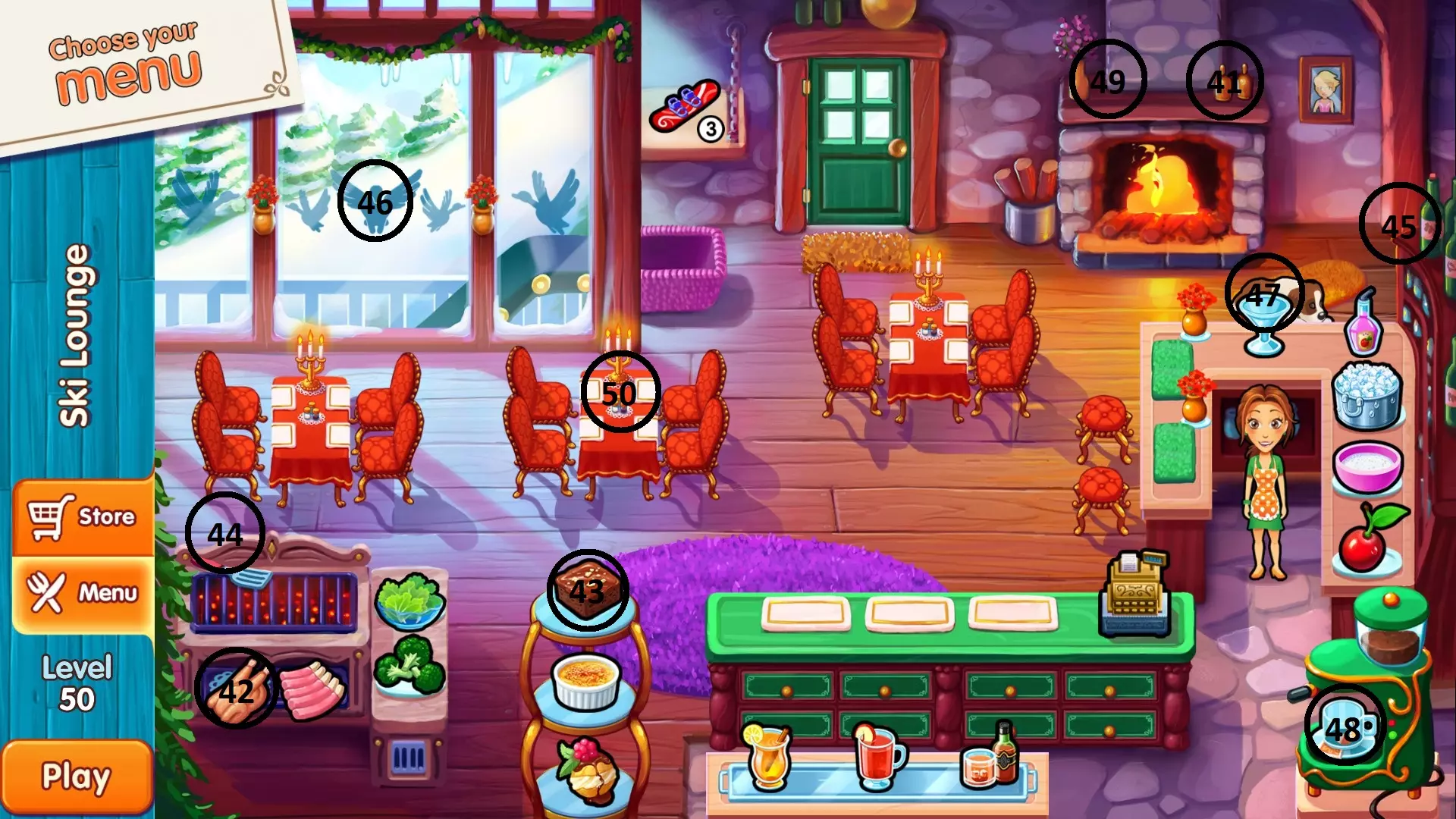 滑雪休息室 第五家餐厅:滑雪休息室 关卡 位置 41 壁炉架顶部 42 烤架旁边 43 甜点托盘第二层 44 烤架后面 45 酒瓶后面 46 从窗户向外看 47 鸡尾酒杯后面 48 咖啡机下方 49 壁炉架顶部 50 中间桌子的桌面上