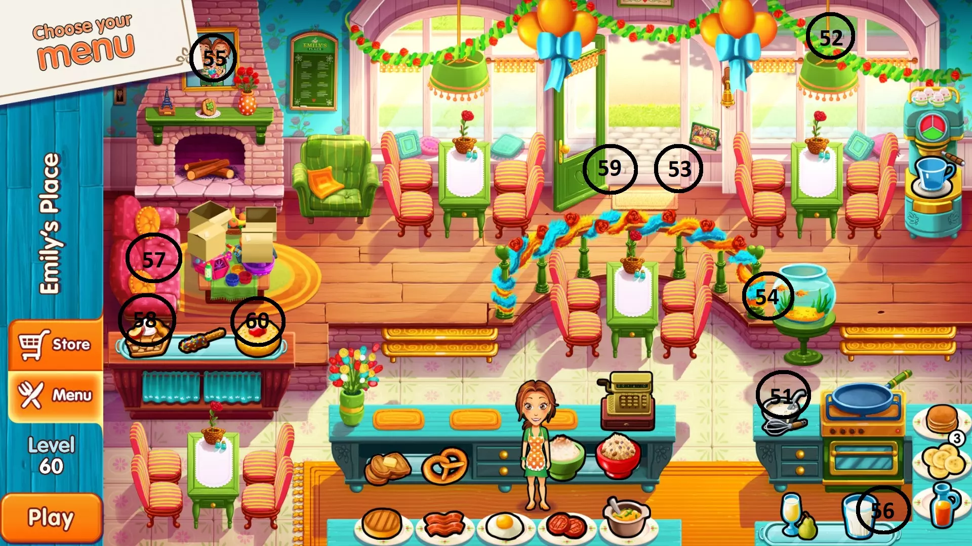 艾米丽的小店 第六家餐厅:艾米丽的小店 关卡 位置 51 面糊上方 52 窗外人行道附近 53 前门旁边 54 右侧栏杆后面 55 家庭照片前面 56 果汁和配料附近 57 沙发中间靠垫上 58 甜品柜台左侧 59 绿色门附近 60 甜品柜台右侧