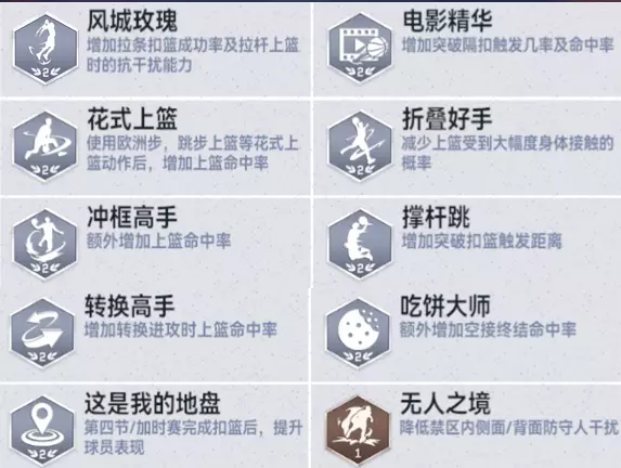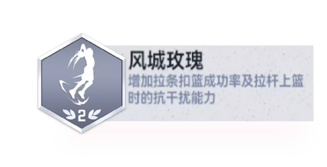 【风城玫瑰】徽章更进一步强化了拉条扣篮成功率和拉杆上篮的抗干扰能力,让他在篮下的每一次出手都充满威胁。
