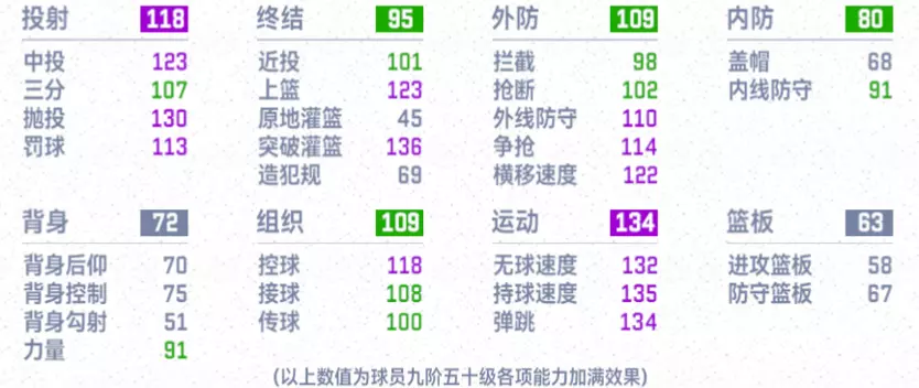 配合突破解锁的增益效果;完美中投概率↑、抗干扰中投↑、突破隔扣成功率↑、优势上篮动作等增益,满突的罗斯将化身进攻端近乎无解的得分机器。